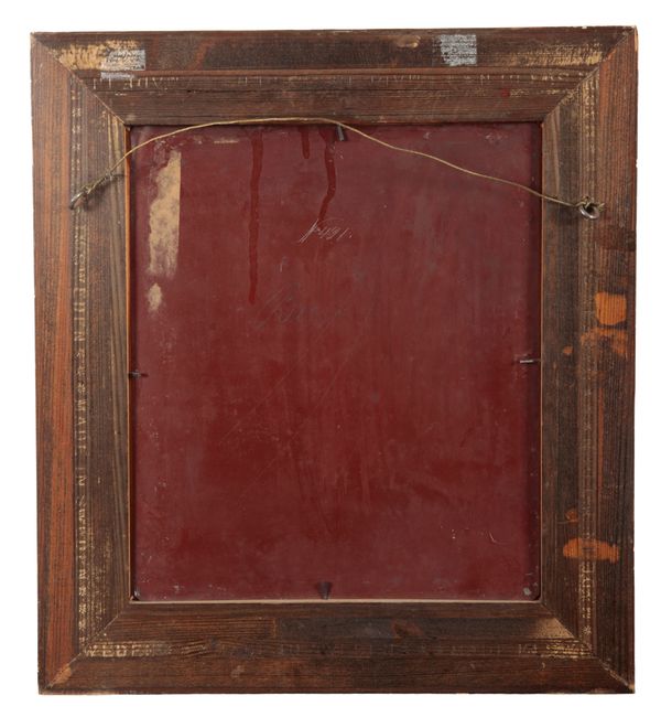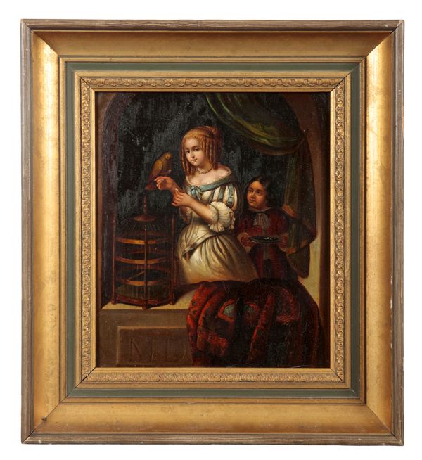 with serving lady behind, unsigned, oil on metal panel, 23.5cm x 20cm