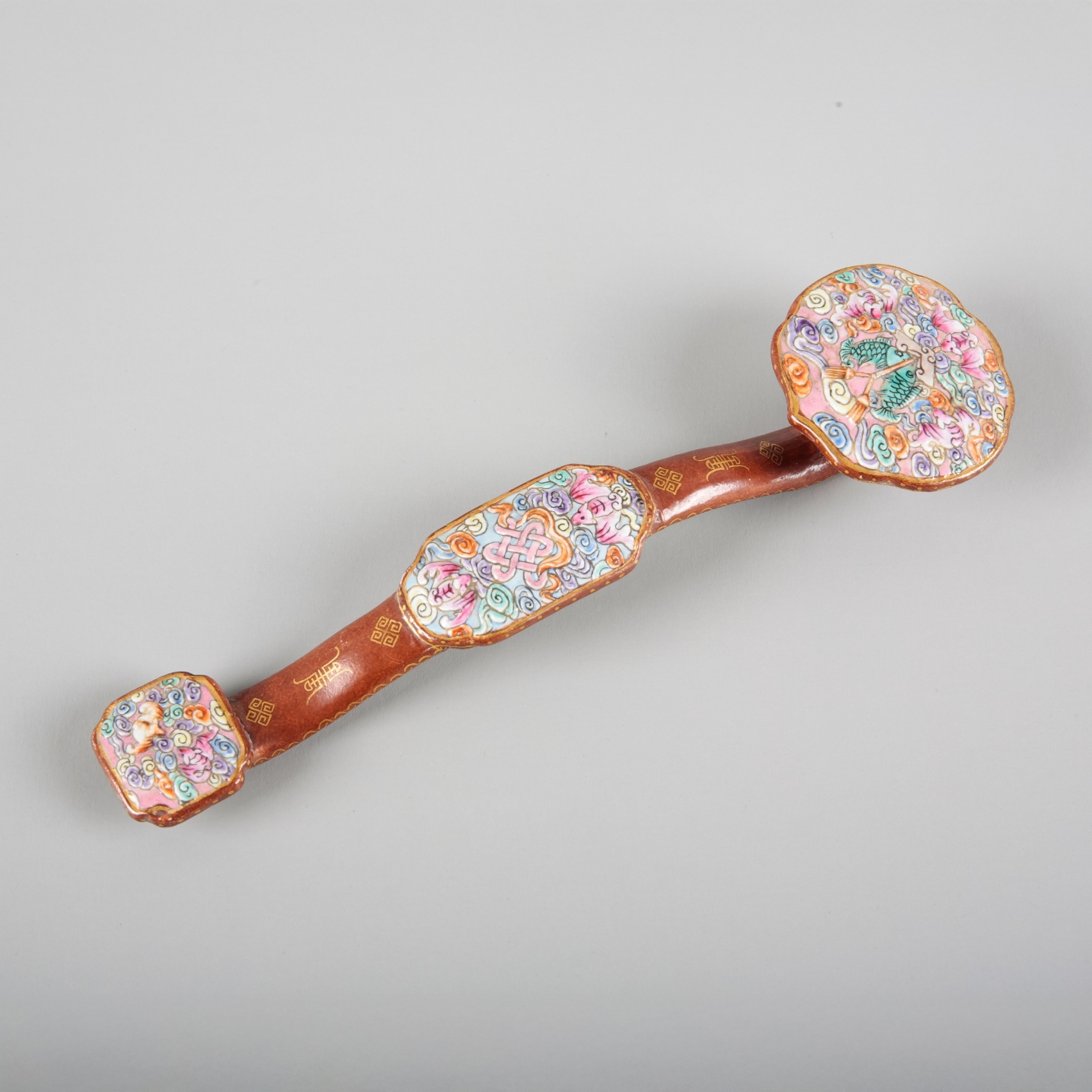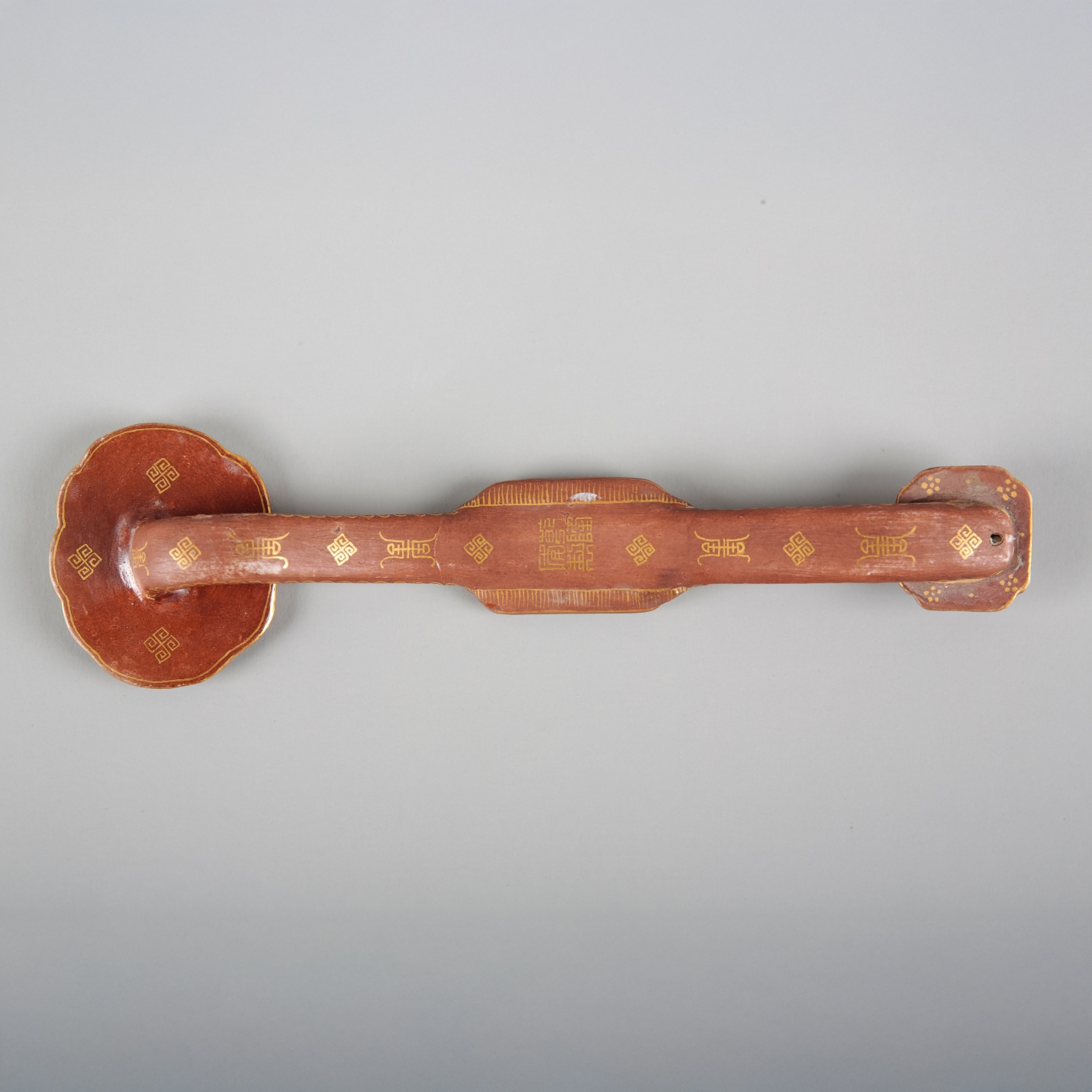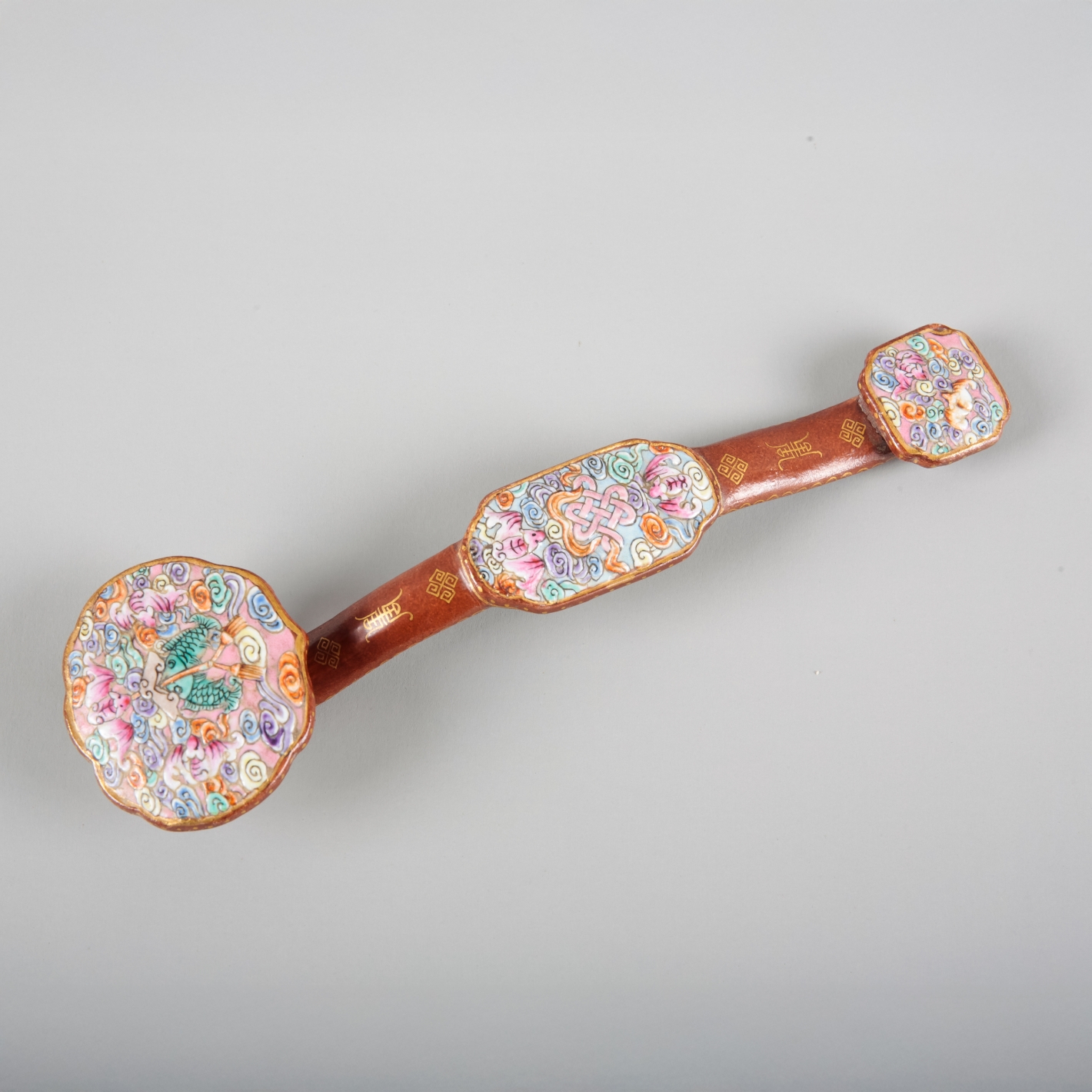 probably 20th century, the panels decorated with auspicious symbols and bats amongst clouds, the handle highlighted in gilt, 18.5cm long