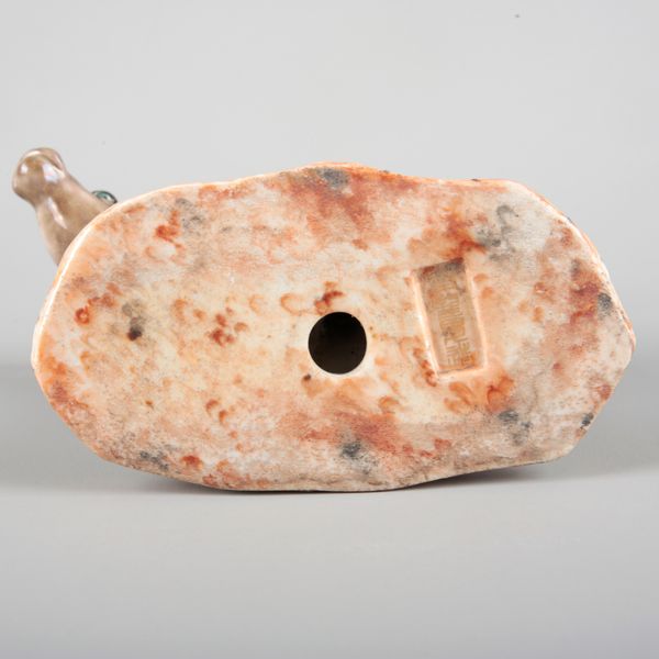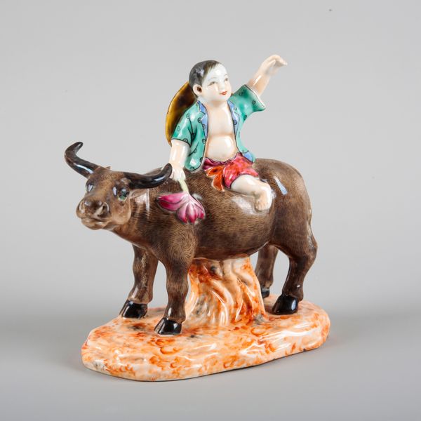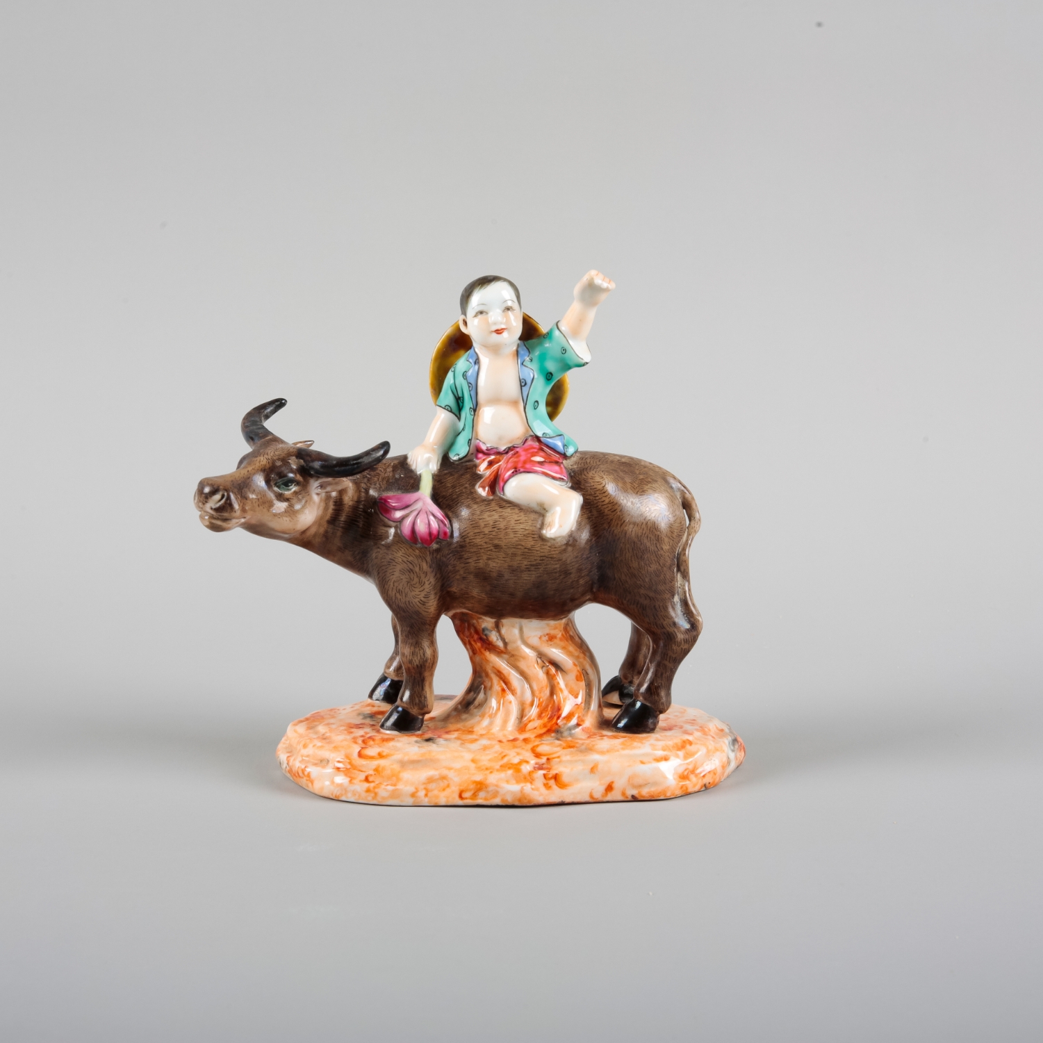 the base with a gilt seal mark in an impressed recess, the boy figured with left arm raised, on a naturalistic ground, 12.5cm high x 12.5cm wide