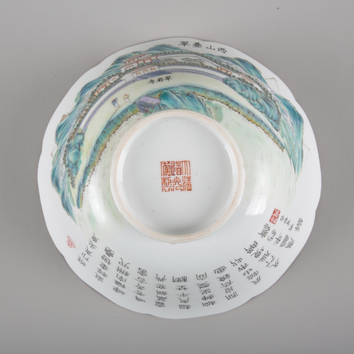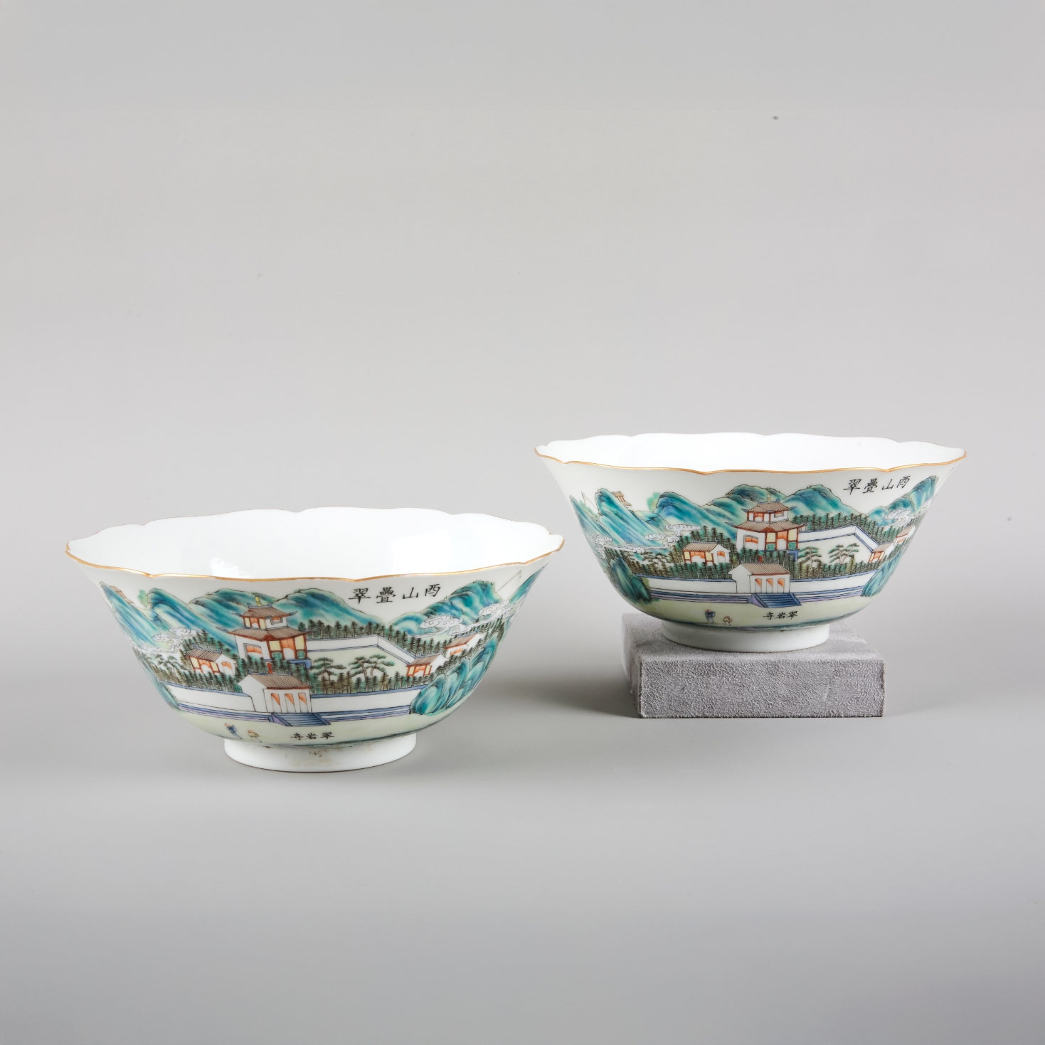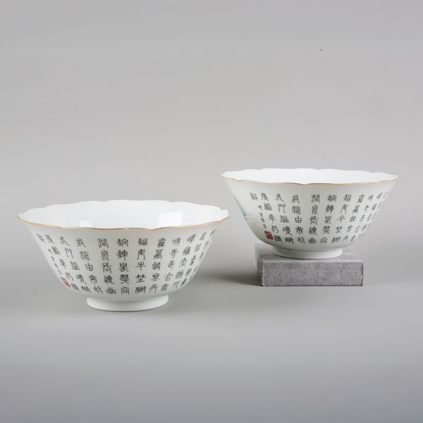 each bearing six character Daoguang seal marks to the base, decorated with pagodas in a mountainous landscape and bearing a long inscription, with shaped rims, 8cm high x 18cm diameter (2)