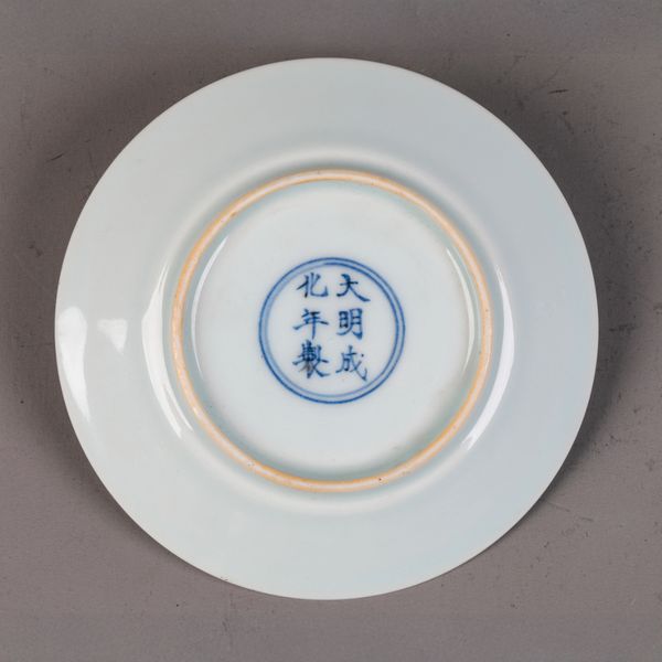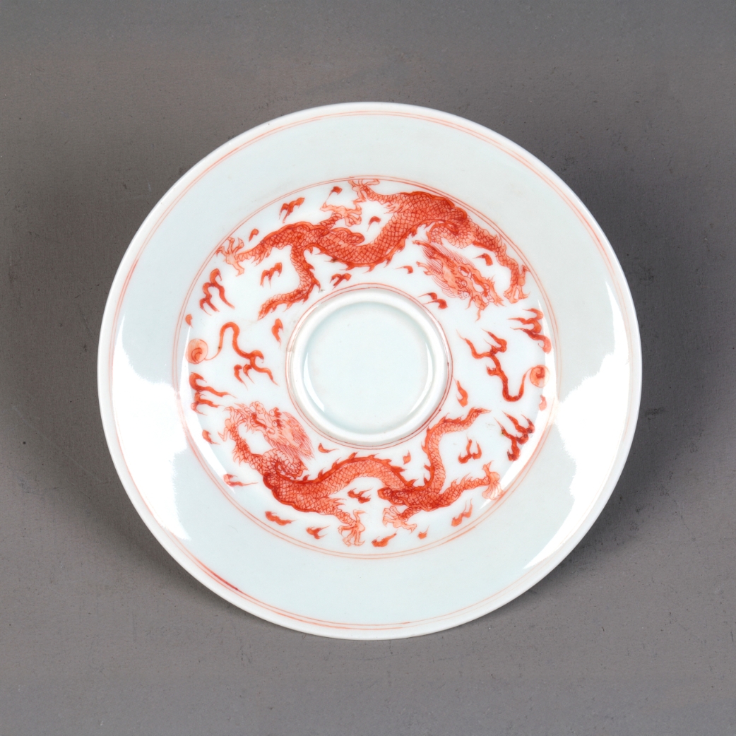 bearing a six character Chenghua mark but later, decorated with dragons chasing pearls amongst flames, 11cm diameter