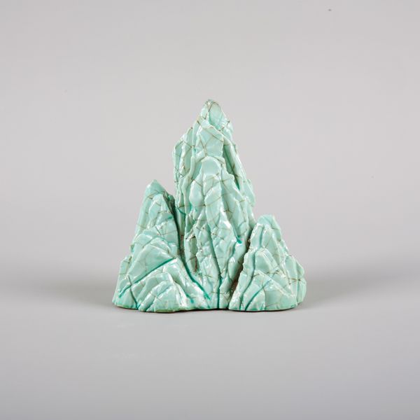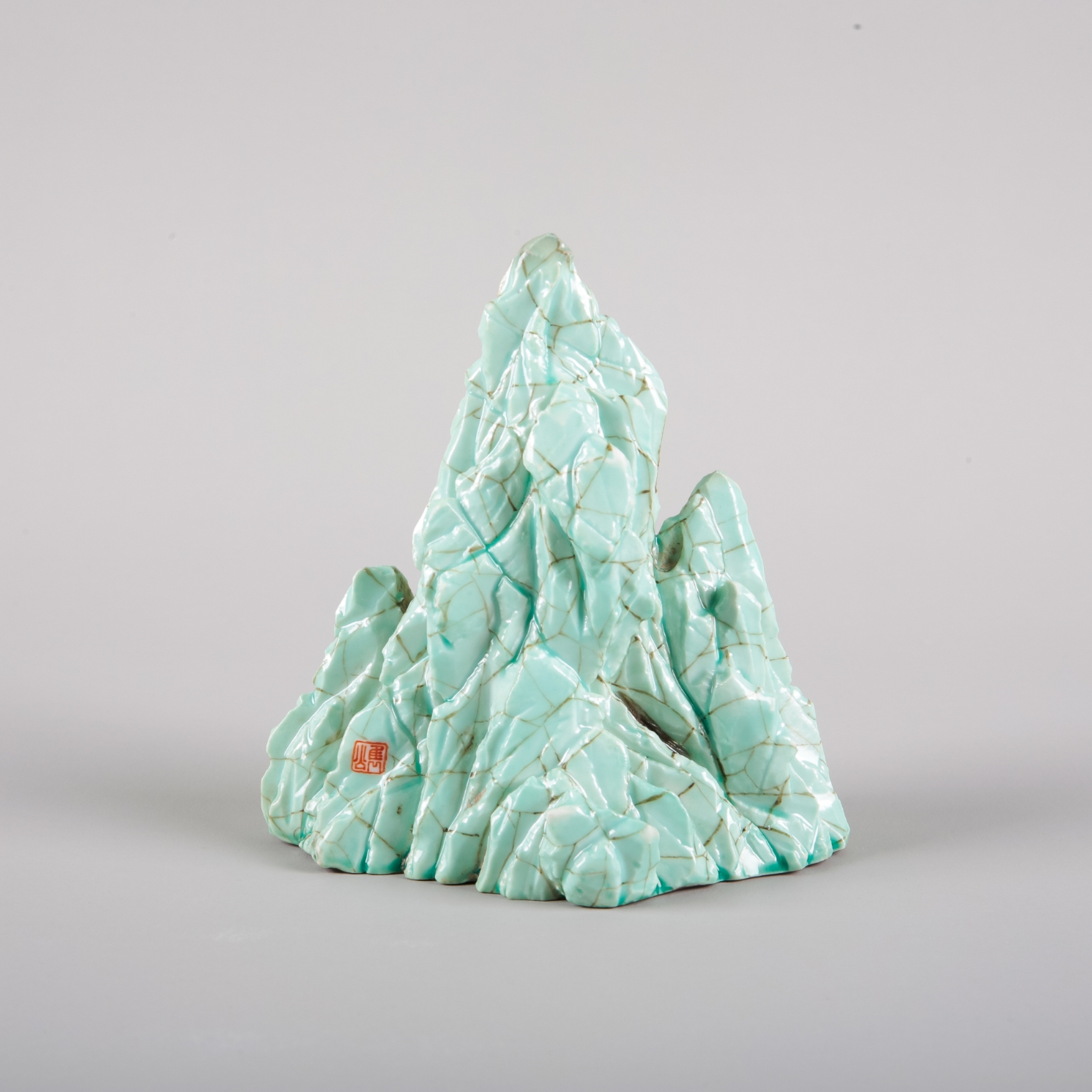 bearing a seal mark to the front in red, naturalistically formed, with a brown glazed base, 10cm high x 9.5cm wide