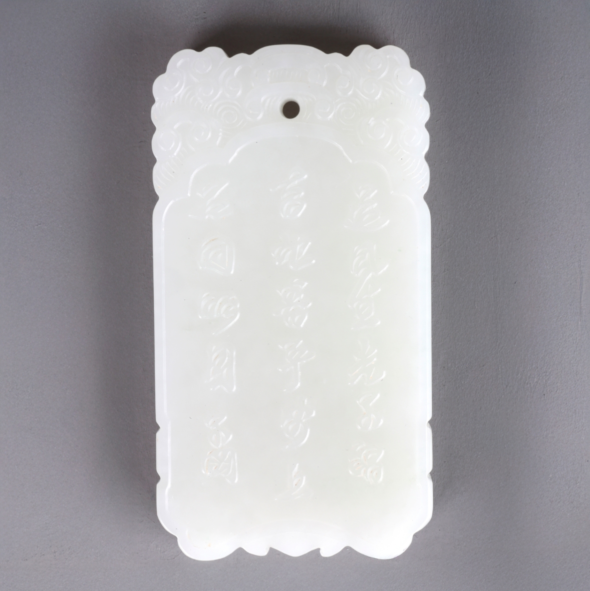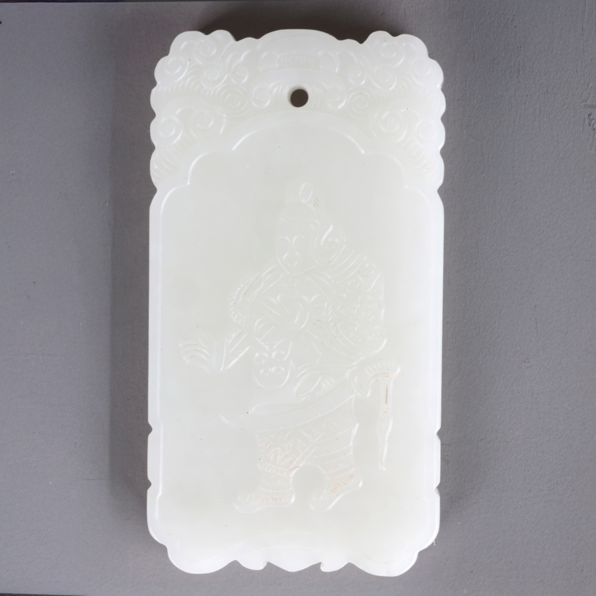 probably late Qing dynasty, carved in relief with an inscription to one side and a warrior immortal the other, a pierced aperture to the top, 7cm high x 3.7cm wide