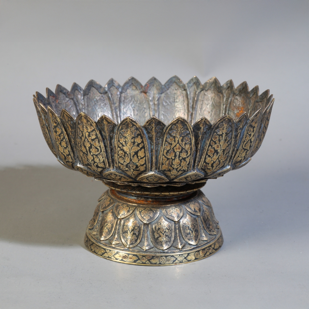 19th century, the bowls of petal form and finely decorated with foliate inlay, on a stepped plinth base, 12cm high x 18cm wide