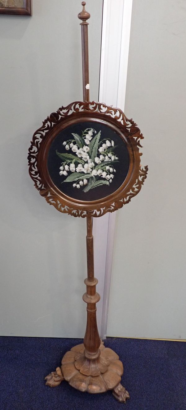 19th century, of curvaceous outline upholstered in lime-ground floral tapestry, terminating to the front on cabriole legs with brass castors, 96cm high x 56cm wide x 50cm deep; together with two mahogany carver dining chairs with pierced splats and tapestry seats, the taller of the two, 98cm high (3)