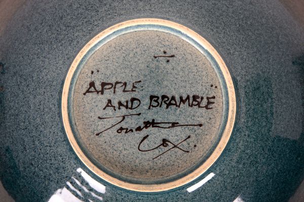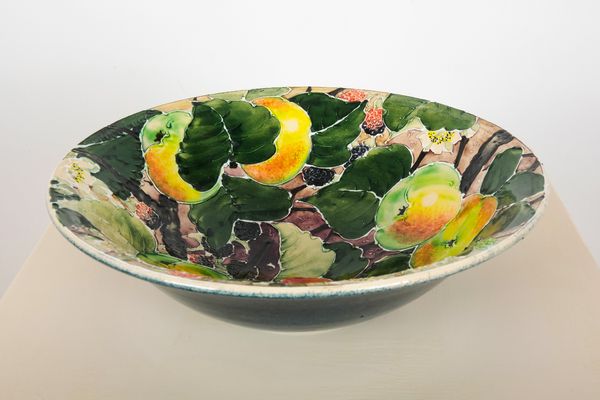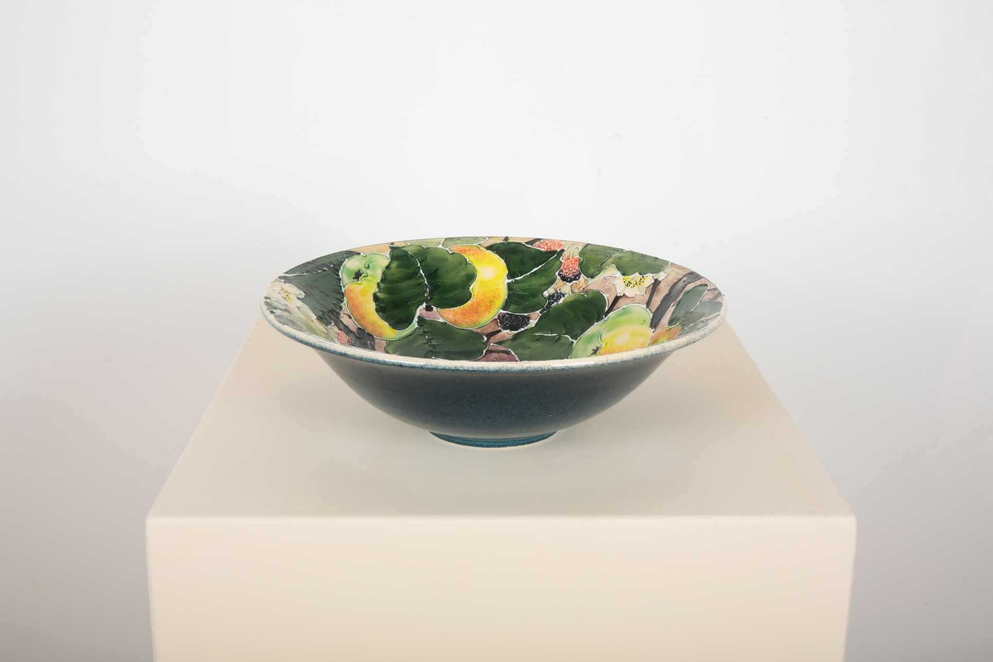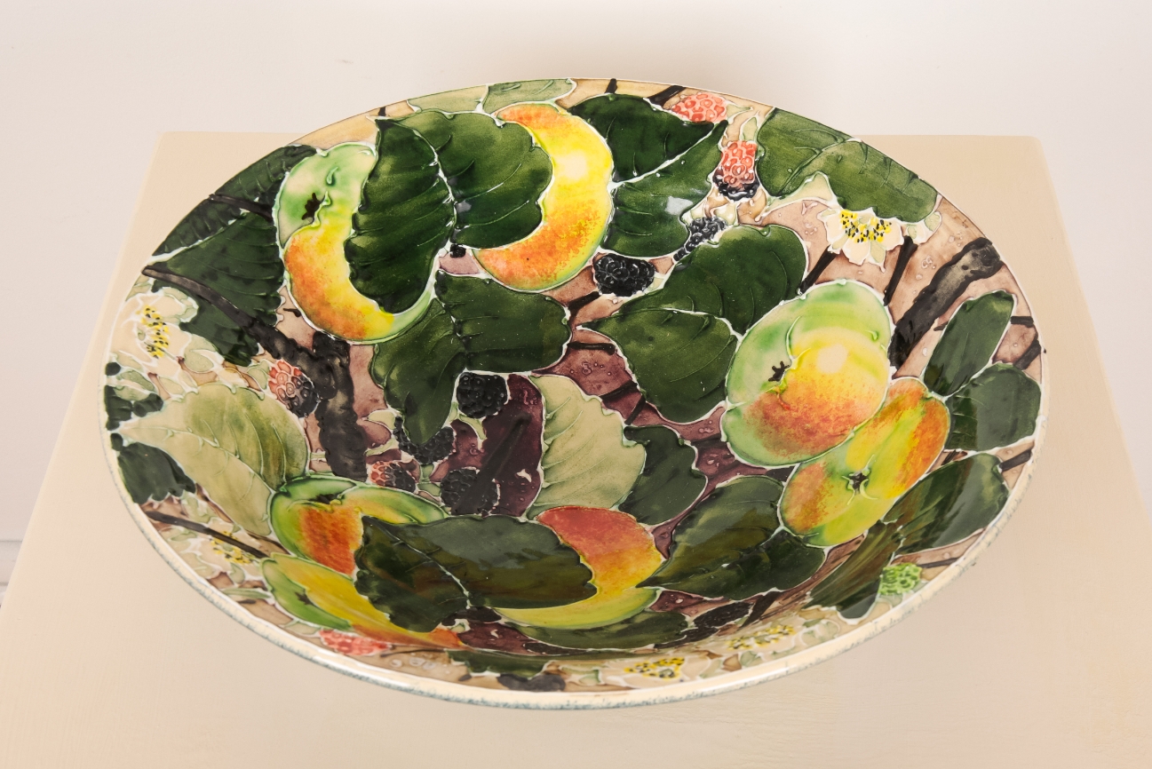 signed and titled verso, decorated with bas-relief green apples, brambles and blossoms, with slightly everted rim, 37cm diameter