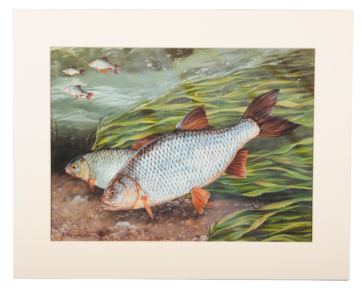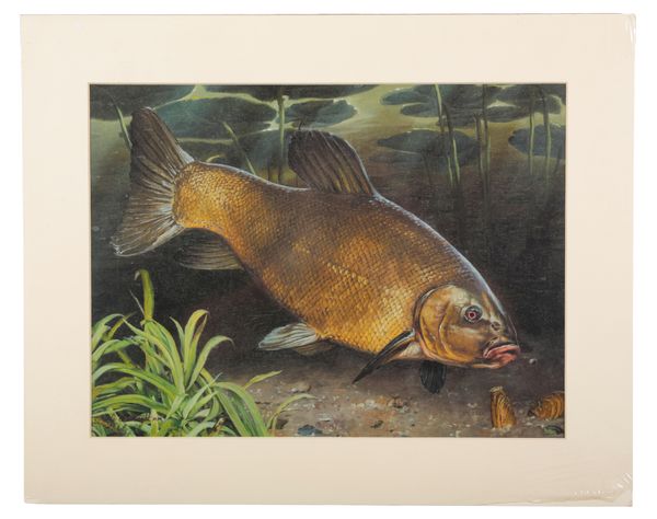 depicting a tench and a roach in their natural settings, offset lithographs in colours, 28cm x 38cm (2)