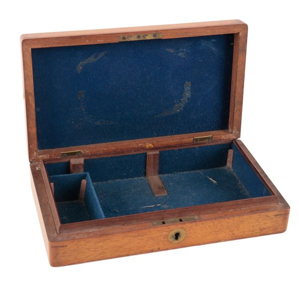 Some surface marks and scratches as one would expect with age and use, small indentations also present. The lid sits flush with the body. Adhesive marks to the inside of the lid - possibly from an old label. Loss to the interior dividers. Wear to the keyhole. Otherwise in good overall order.