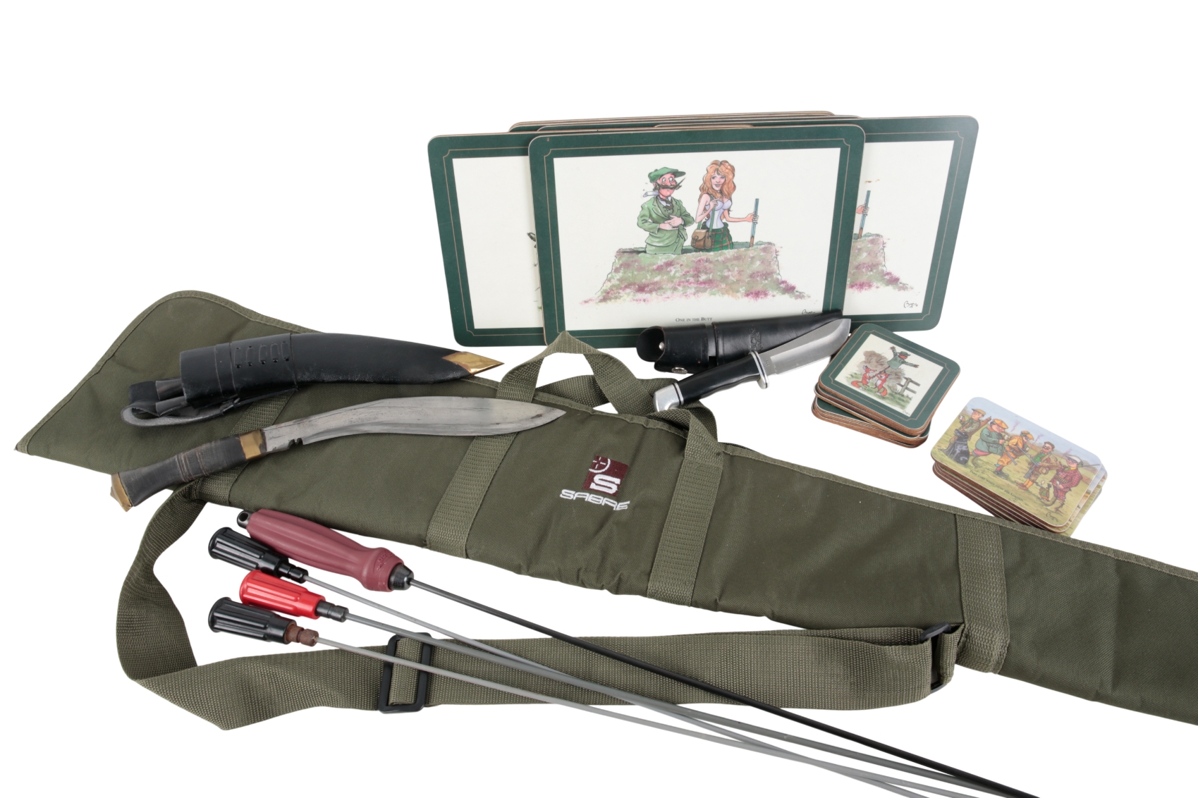 together with a canvas fleece lined gun sleeve; a Kukri knife in its original leather sheath, 40cm long; a Buck hunting knife in its original leather sheath, 24cm long; and various shooting scene place and drinking mats (a lot)