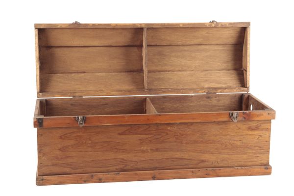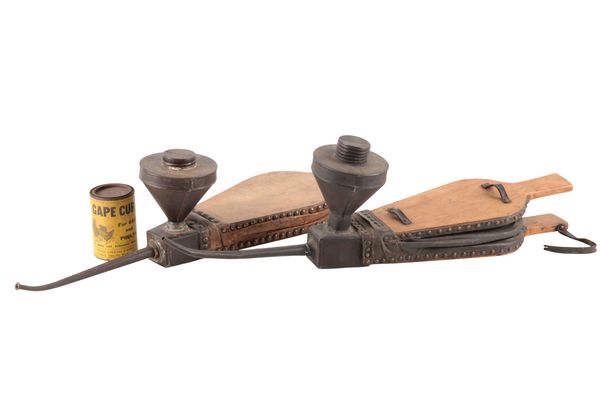 32cm high x 84cm long; together with two sets of metal and leather bellows, the largest 66cm long; and a tin of 'Cape Cure' for Game and Poultry with safe effective remedy, in its original packaging (4)