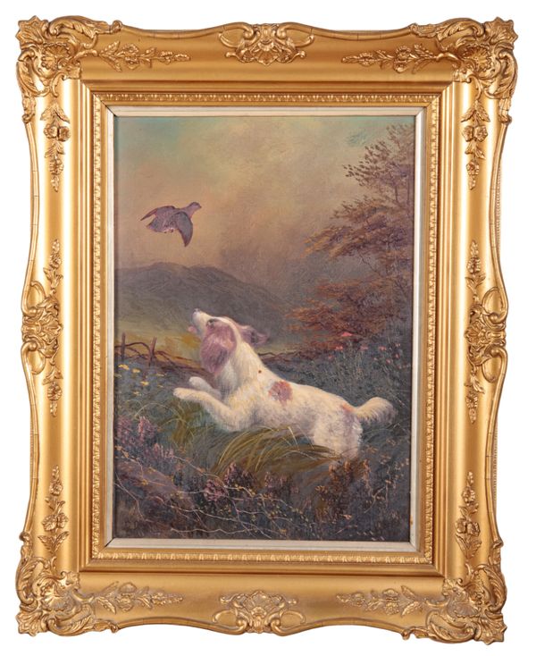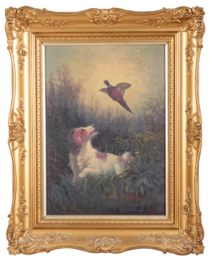 depicting dogs chasing pheasants, bearing signatures, oils on canvas, 34cm x 23cm each (2)