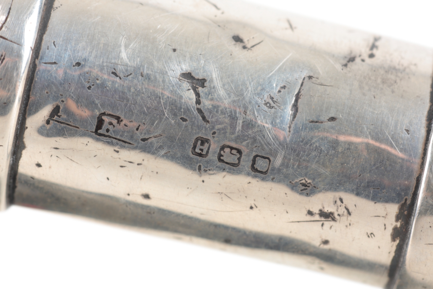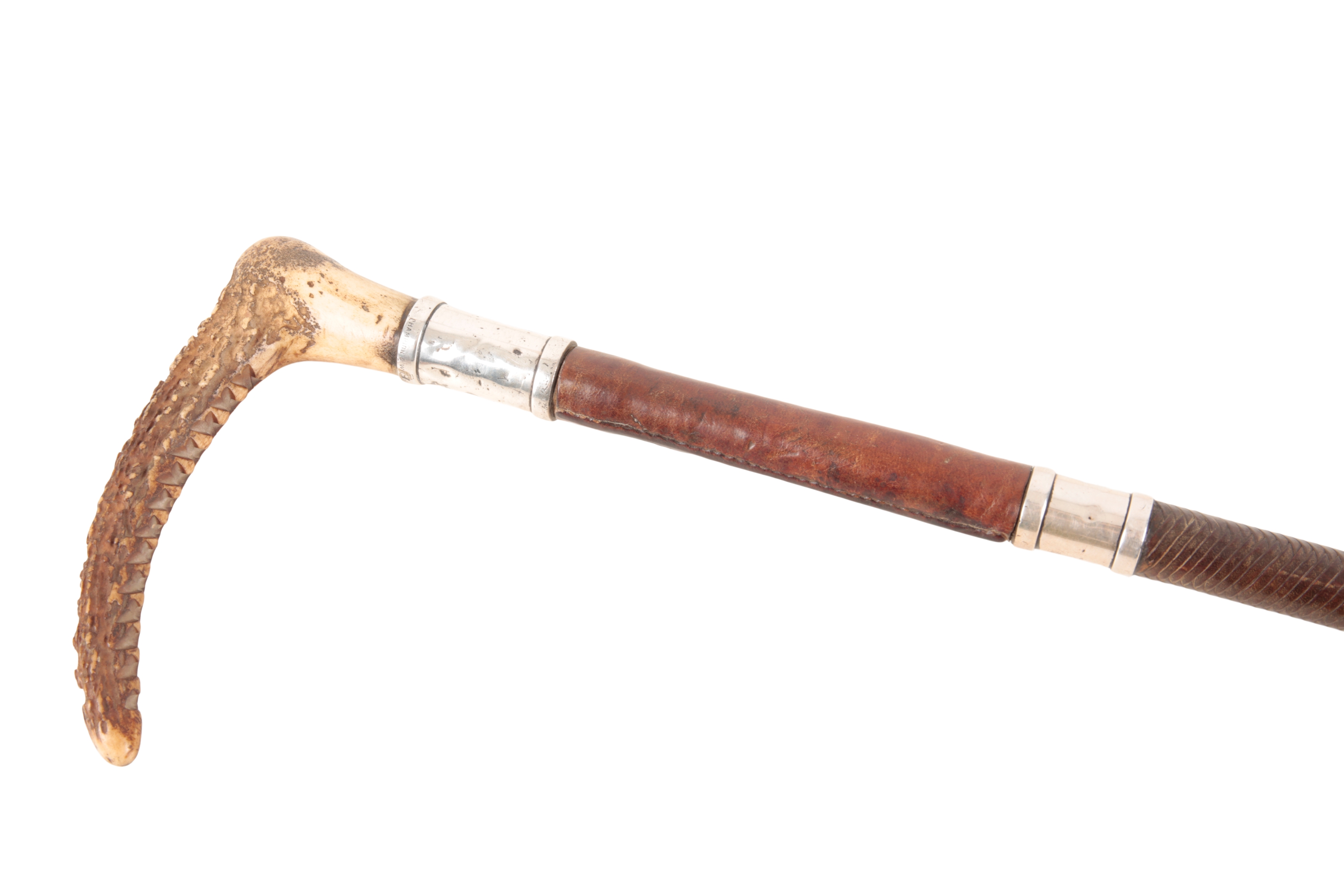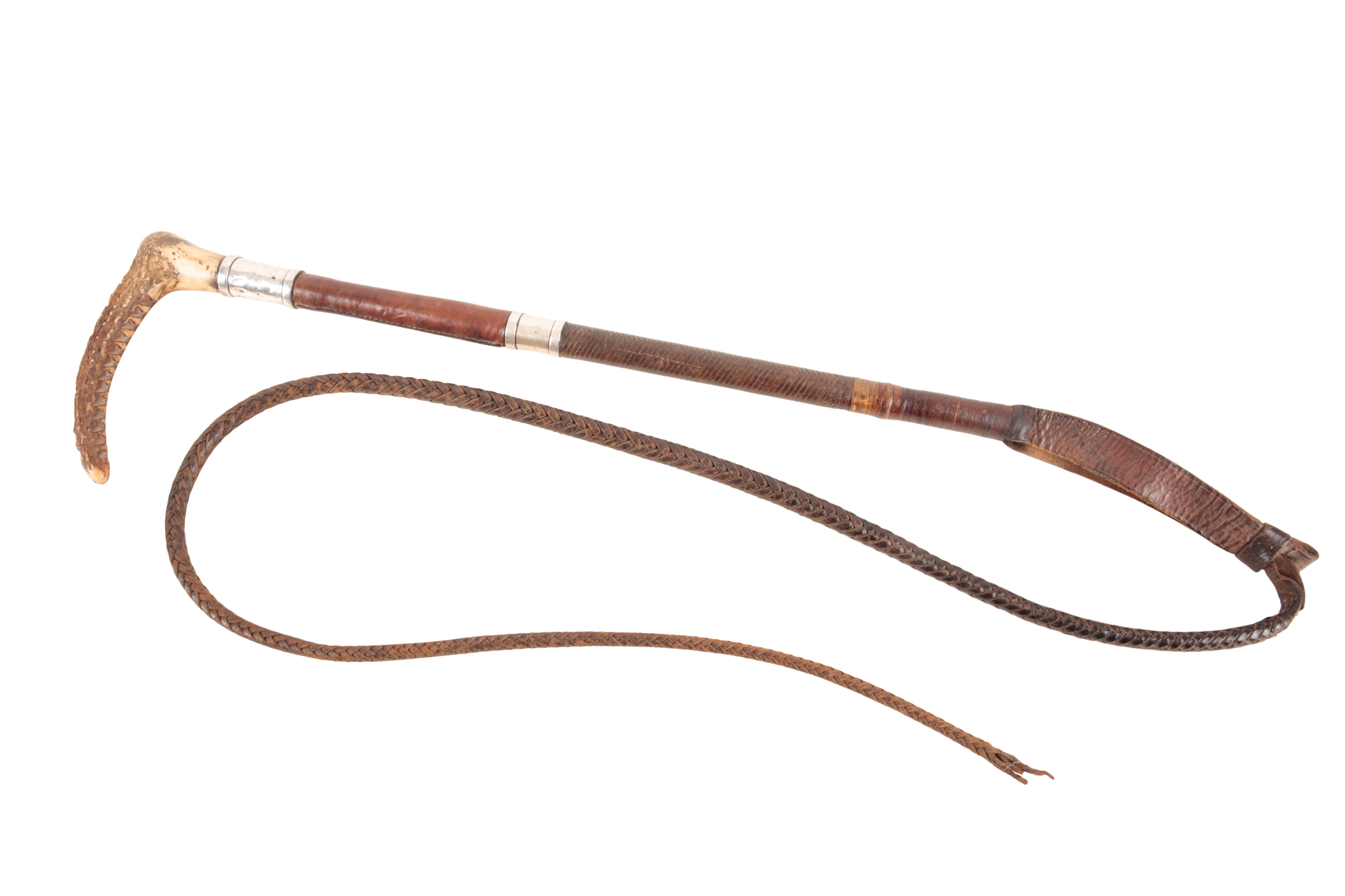 with horn handle, leather grip plaited shaft, two silver hallmarked ferrules, and braided thong, 50.5cm long