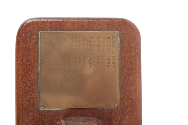 stamped near the flared mouth 'proprietors of Kohler & Son' and '9th October 1956 Budleigh Salterton S.W.E.B' opposite, mounted on a wood plinth, bearing brass plaque engraved with dates from 1957-1972, with another blank for future use, 11cm high (horn on stand) x 31cm long x 11cm deep (including mount)