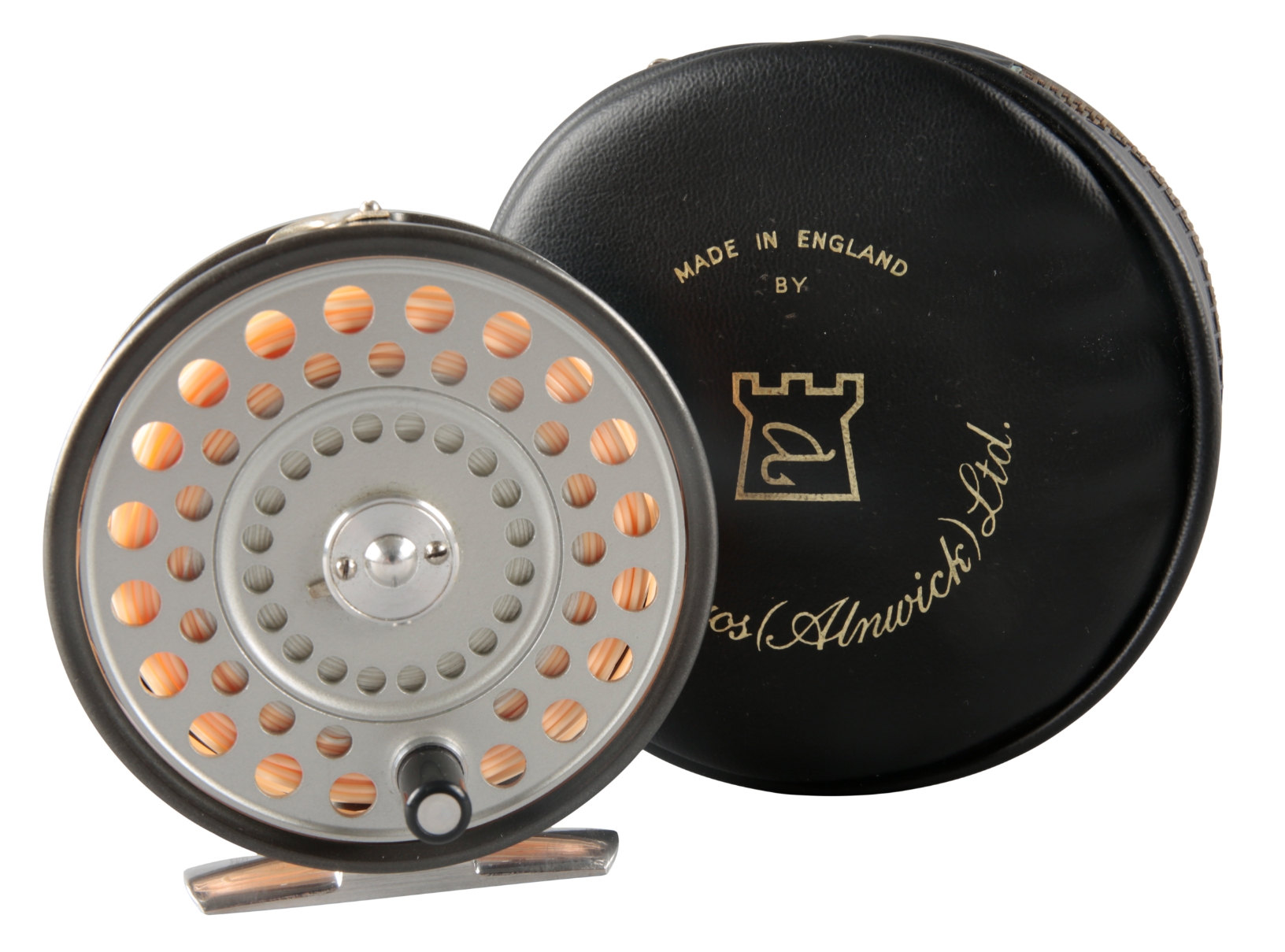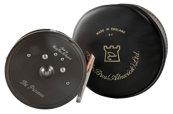 with smooth alloy foot, ebonite handle, two screw latch and steel tension screw, in its original Hardy reel pouch; together with a Cortland WF5F fishing line, size 3 1/2" (2)