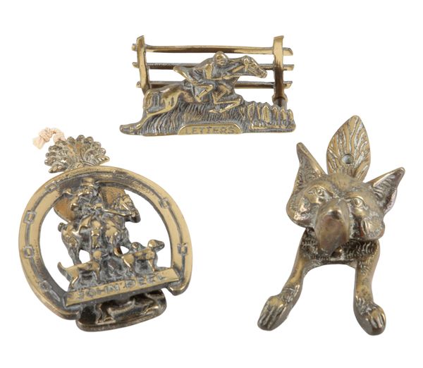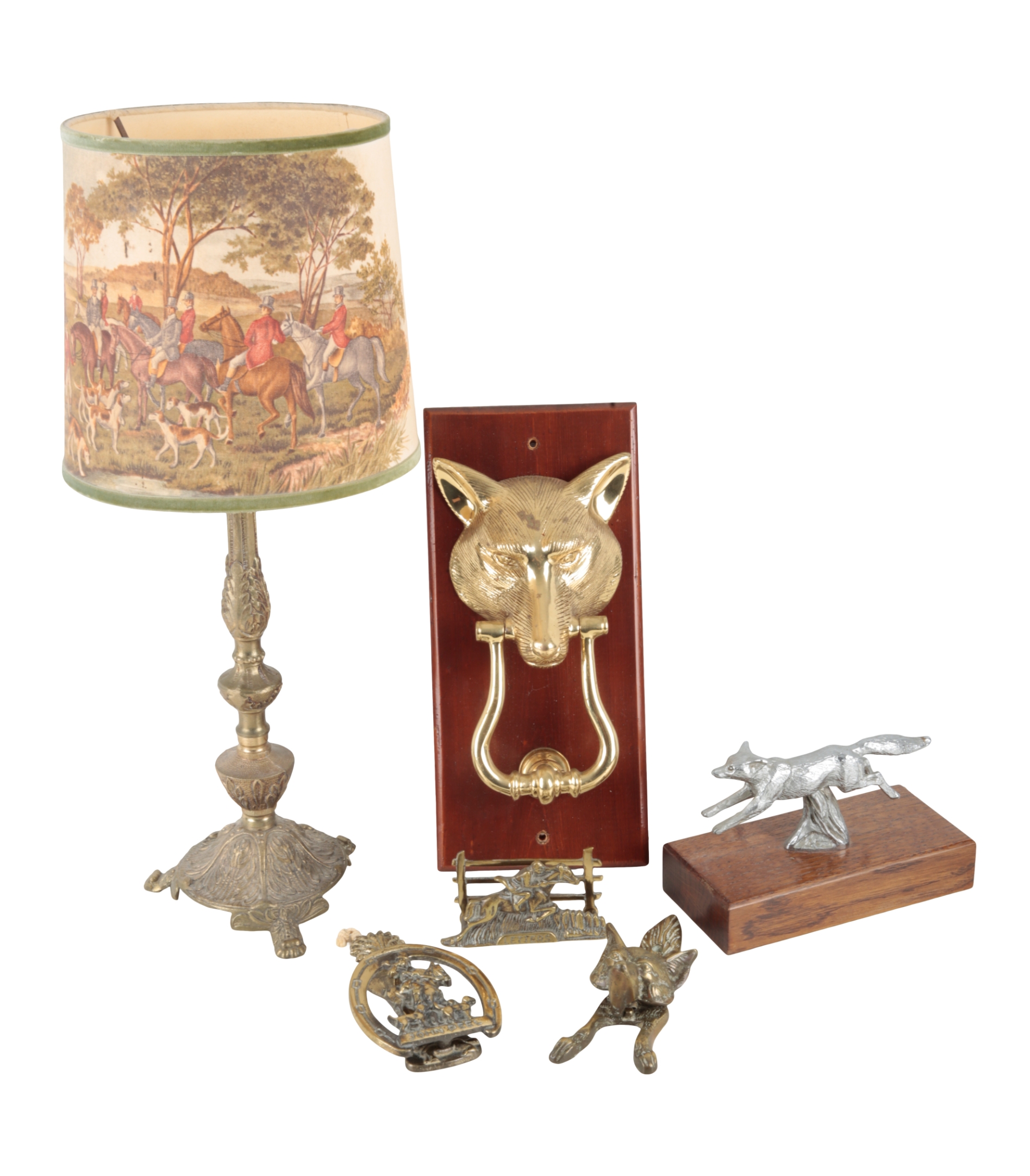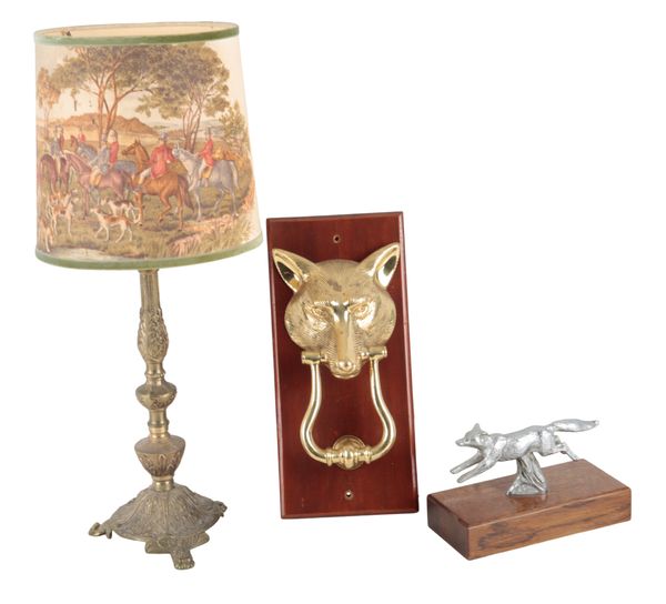 the larger, a fox mask mounted on wood base, the second with mask, brush and legs; together with a 'John Peel' door knocker; a fox mascot mounted on wood plinth; a brass letter rack with rider before gate; and a small gilt-metal table lamp with shade decorated with a hunting scene, 49cm high x 20cm diameter (6)