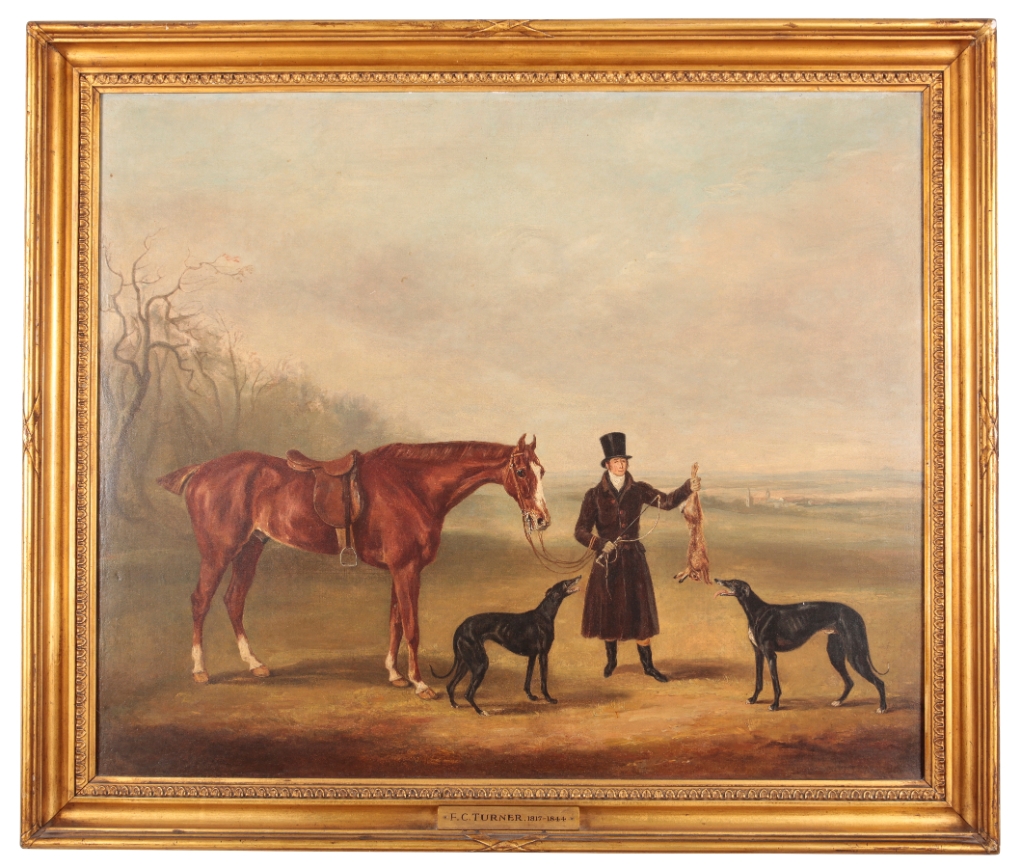 depicting a gentleman holding a hare aloft, accompanied by two sight hounds and a horse, oil on canvas, 64cm x 76.5cm