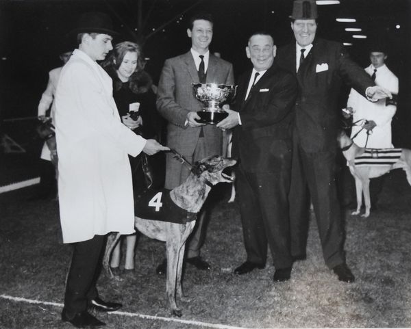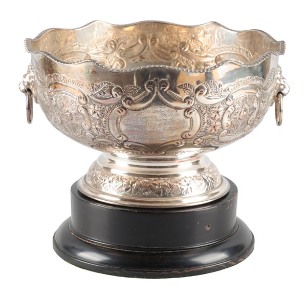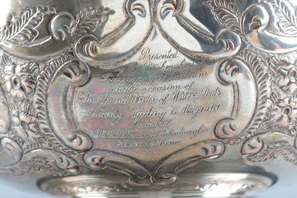 won by the Pigalle Prince at either Walthamstow or Lewisham tracks and presented by the Bookmakers of Harringay Stadium, 6th May 1961, the bowl of 18th century design with gadrooned and shaped rim, floral embossed body and twin ring handles, 18cm high x 32cm diameter, with ebonised stand, 25.5cm high overall, sold with copy of the presentation photograph which depicts Tommy Cooper in attendance