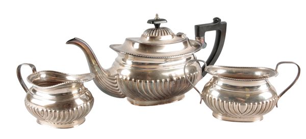 won by the Pigalle Prince at either Walthamstow or Lewisham tracks, with bulbous gadrooned bodies, comprising teapot, 15cm high x 32cm long, sugar, 9cm high x 18cm wide, and milk jug, 9cm high x 14cm wide (3)