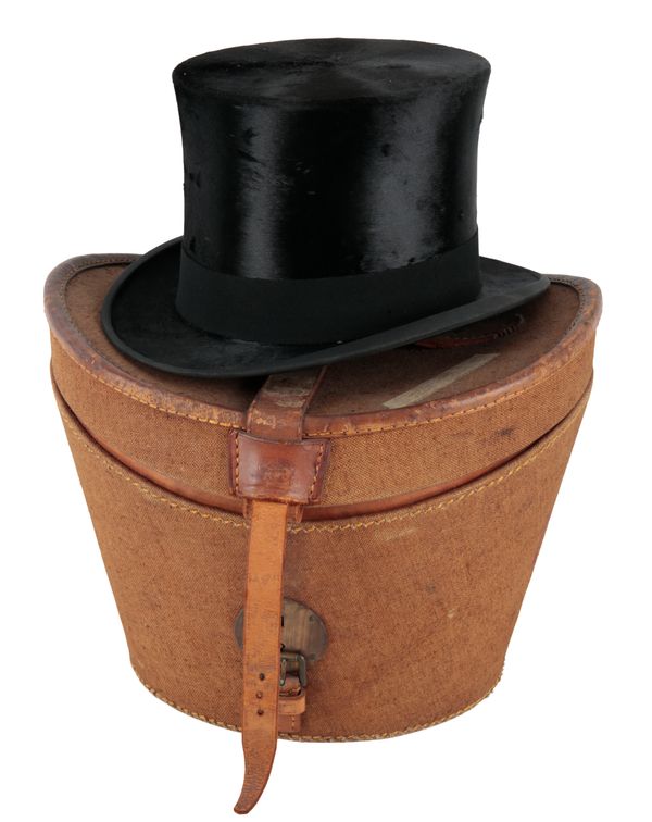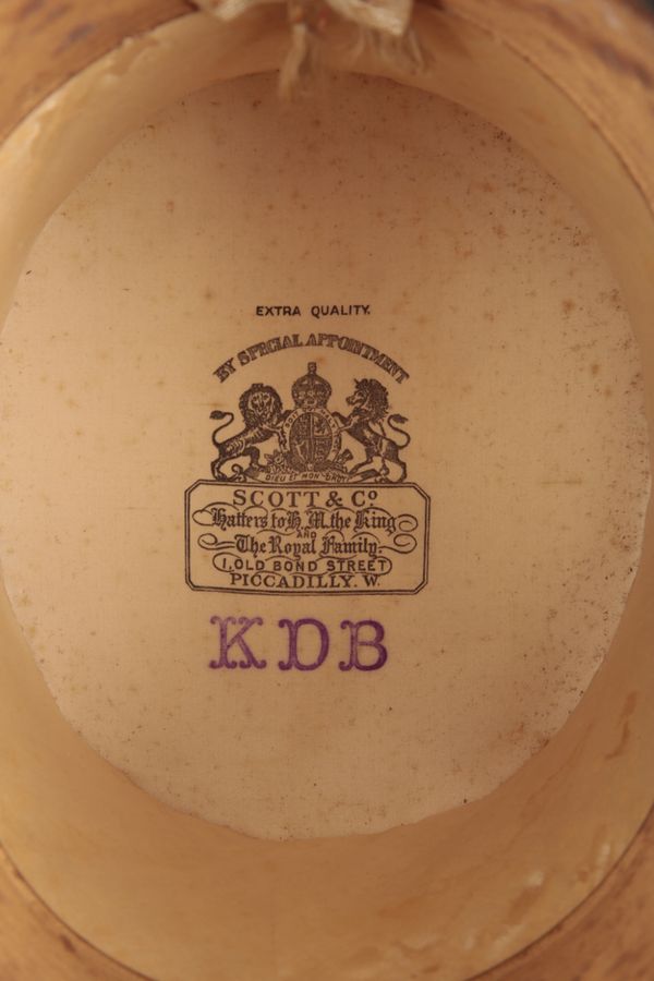 with silk interior and leather band, the interior initialled 'KDB', 6' 7/8" circumference, 5' 1/2" high, within a canvas and leather-bound hat box