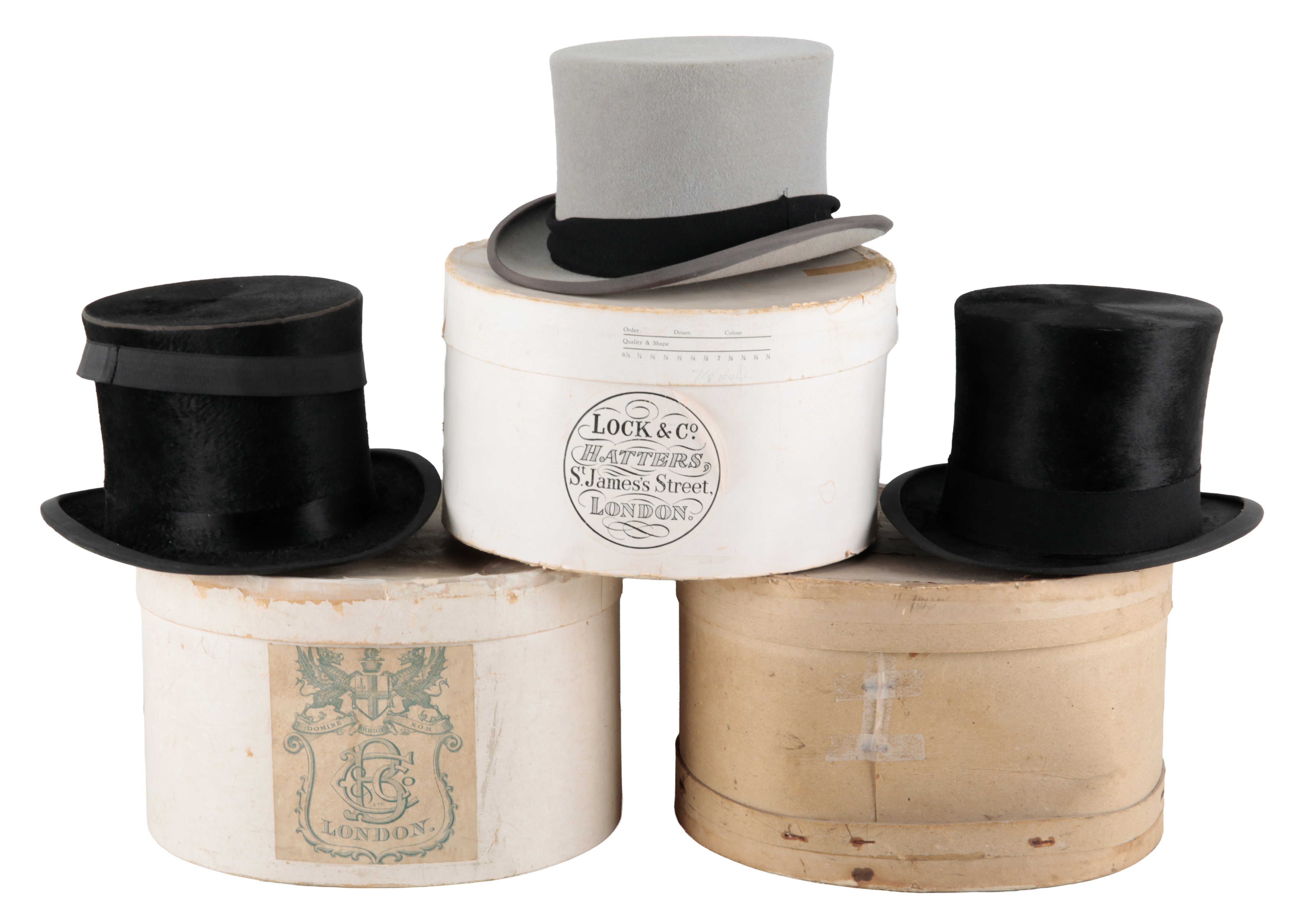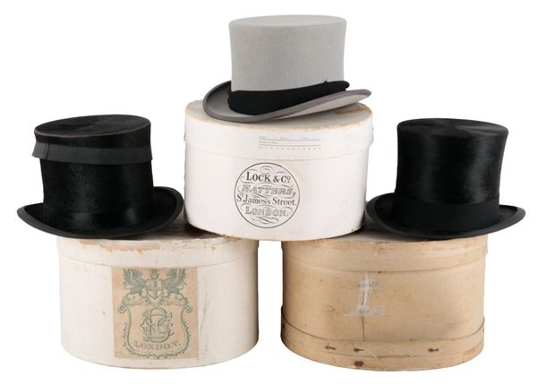 the interior with initials 'RWT', 7" circumference; together with an example by Moss Bros, 6 and 3/4" circumference; and another top hat measuring 6 and 3/4" circumference (3)