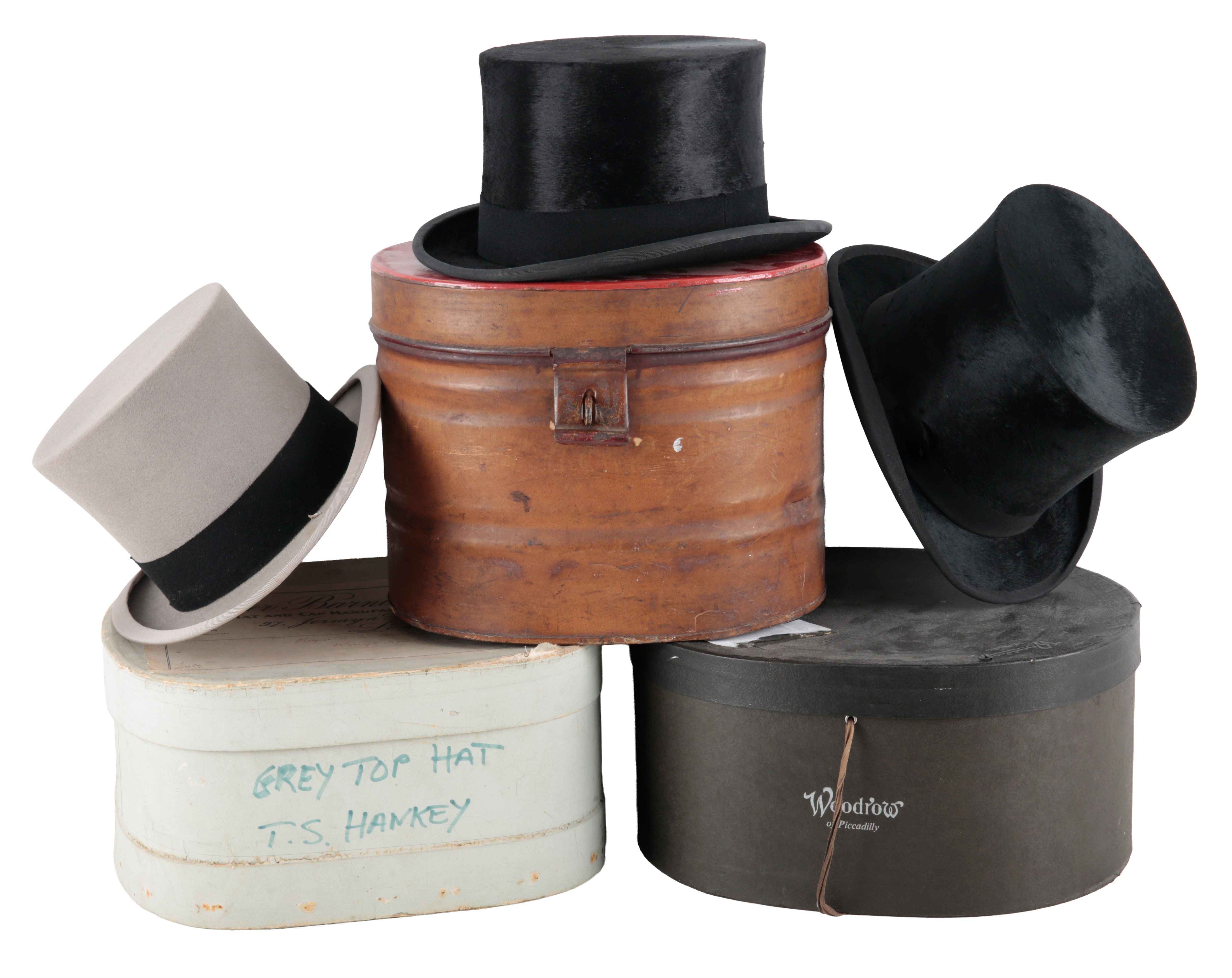 the interior inscribed 'R. Marsman', 6 and 3/4" circumference, with original box; together with a black top hat, 6 and 3/8" circumference, within a metal case; and a grey top hat by Walter Barnard, 6 and 7/8" circumference (3)