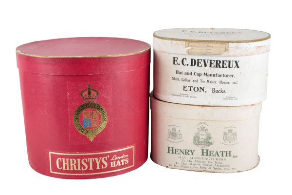 with silk lining and leather banding, the internal circumference measuring 6 and 3/4", height to the crown measuring 5 and 1/2", within original box; together with a black example from Cuthbertson, 6 and 3/4"; a black example from Dunn & co, 6 and 7/8" circumference; and a grey example by A. J. White, 6 and 1/2" circumference (4)