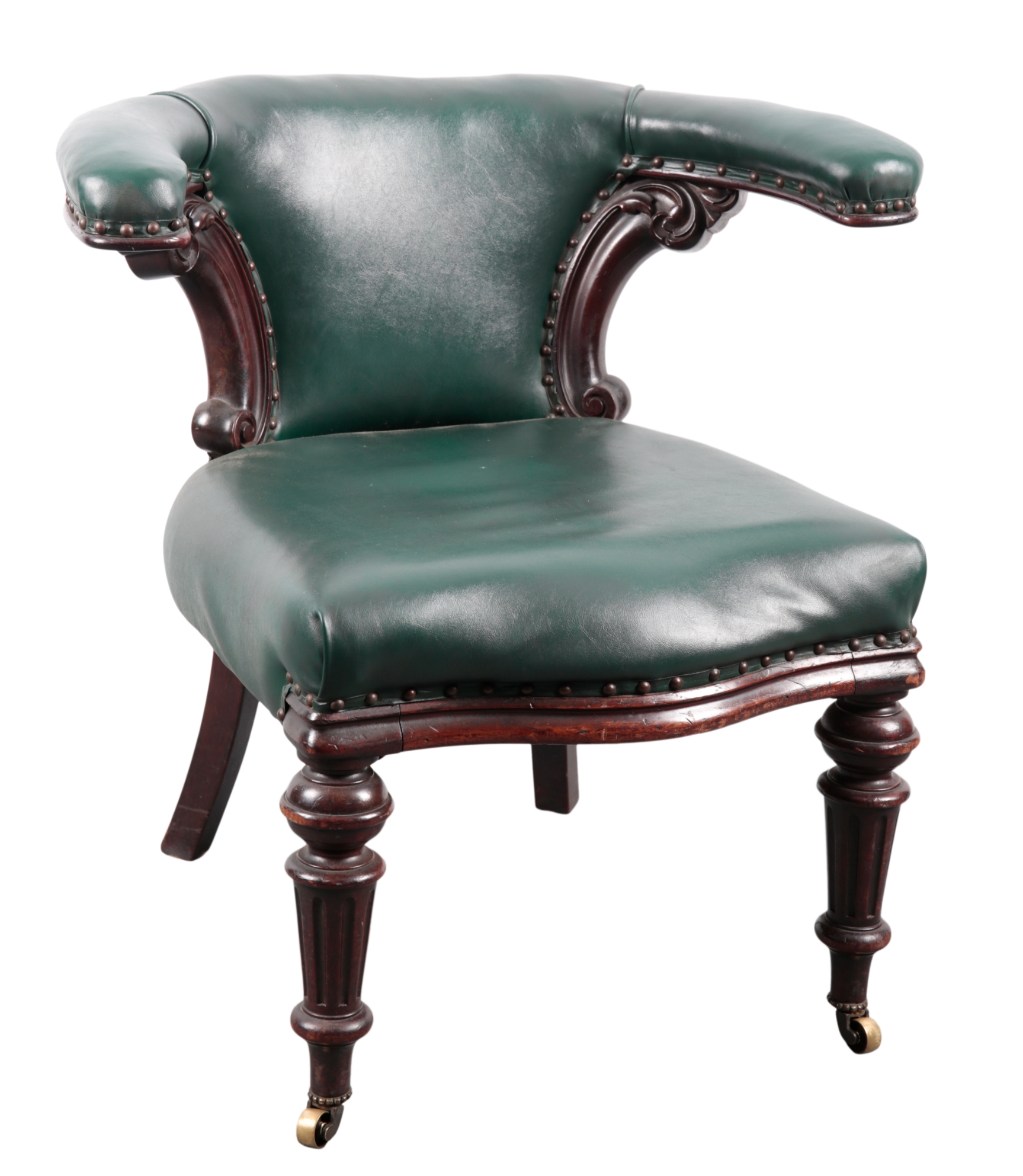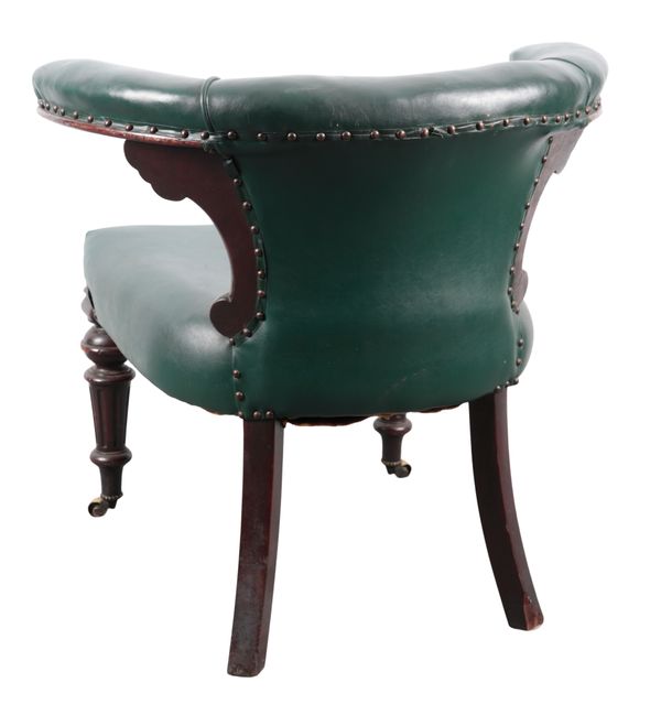 on turned front mahogany legs to brass casters with green leather upholstery, 76cm high x 76cm wide