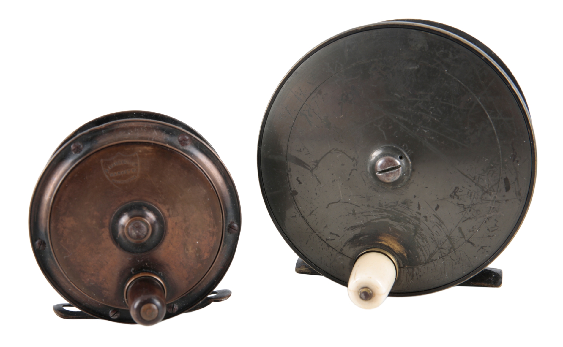 with ivorine handle, perforated foot and old line; together with a Ramsbottom of Manchester 3" All Brass Perfect Style Trout Reel, with perforated foot and horn handle (2)