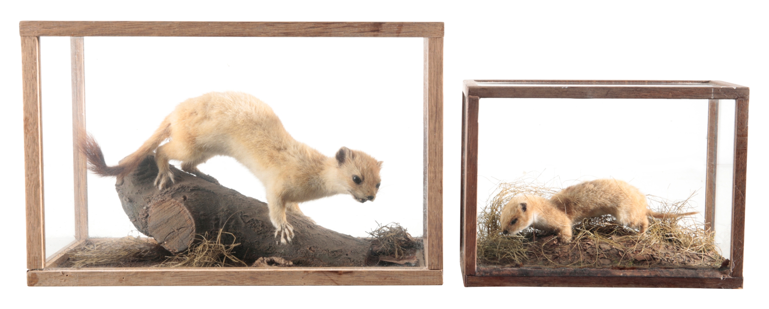 in a glazed oak lined display case within a naturalistic setting, 22cm high x 33cm wide; together with a taxidermy weasel set in a glazed oak lined display case within a naturalistic setting, 17cm high x 24cm wide (2)