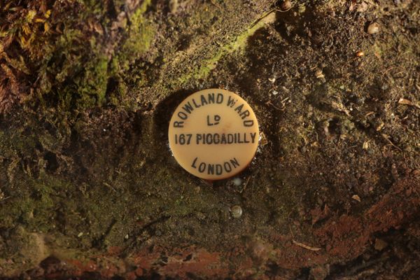 in a glazed oak lined display case set in naturalistic setting, with ivorine Rowland Ward plaque, 17cm high x 22cm wide