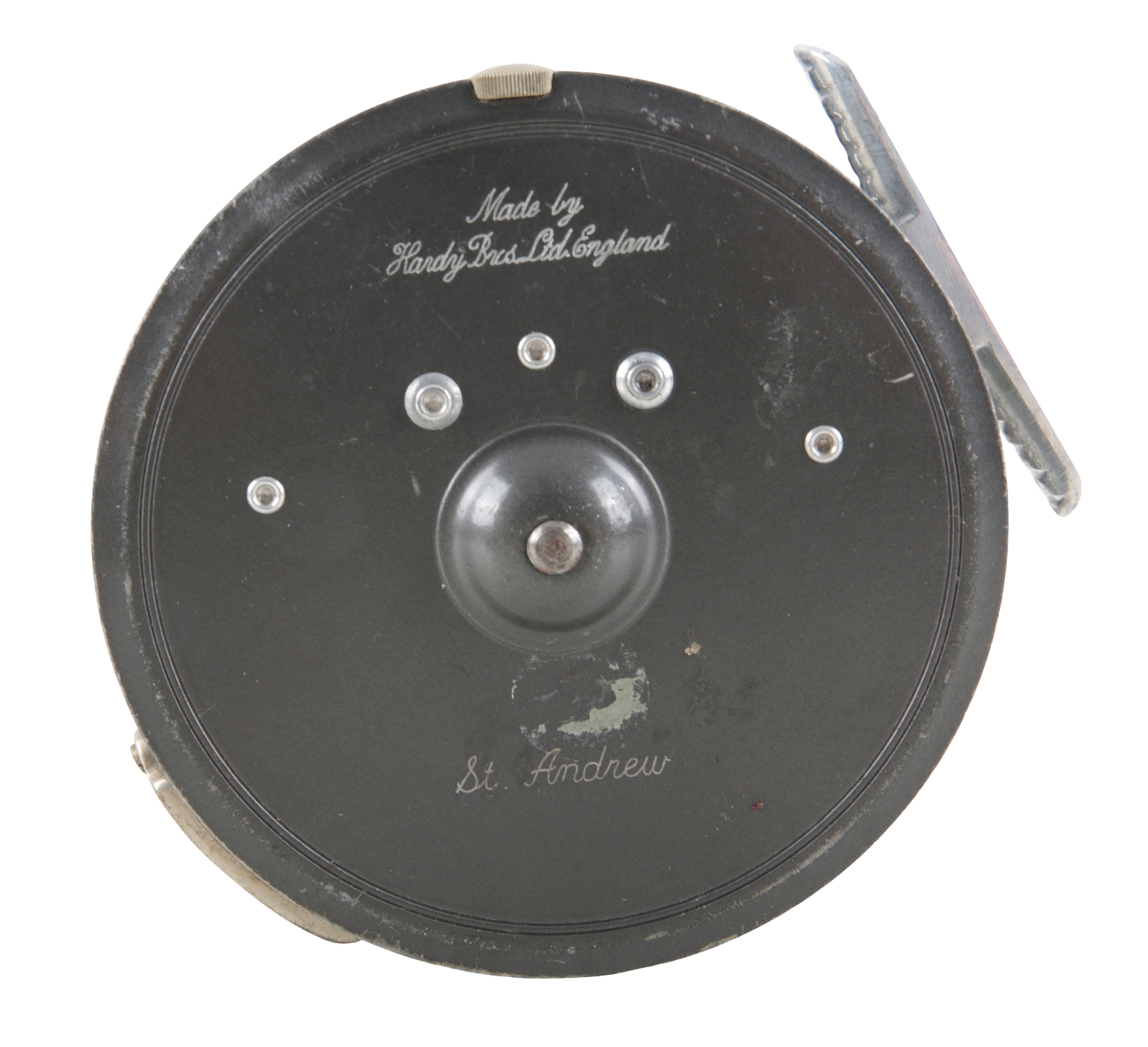 with steel foot, ebonite handle, perforated drum, two screw latch and steel line guard