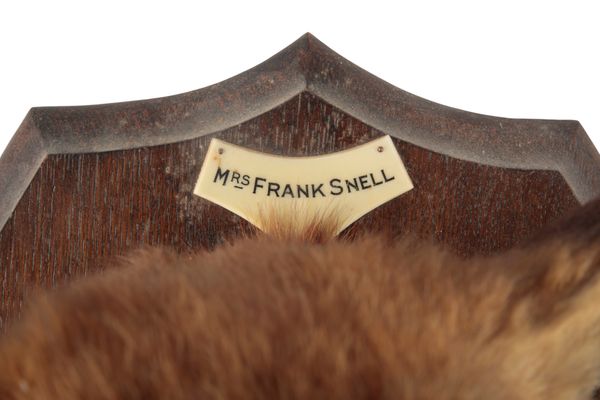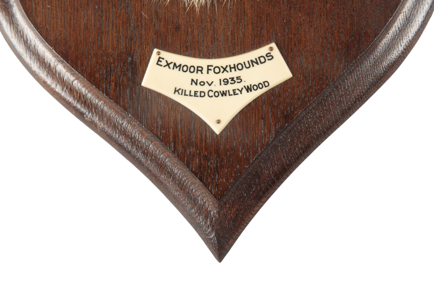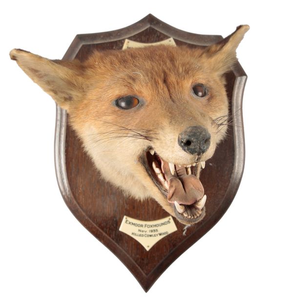 mounted on an oak shield, the ivorine plaque with inscription 'Exmoor Fox Hounds, November 1939. Killed at Cowley Wood', with paper label to the case back 'By Appointment to His Majesty The King. Rowland Ward Ltd, Naturalist, The Jungle, 167 Piccadilly, London, no. 5947', 33cm wide