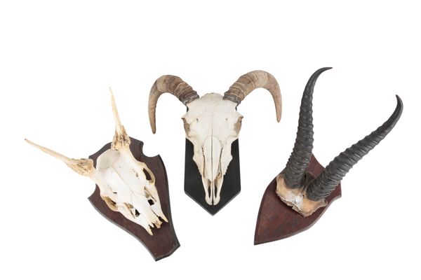 mounted on an oak shaped shield, approx. 30cm high; together with two other skull mounts (3)
