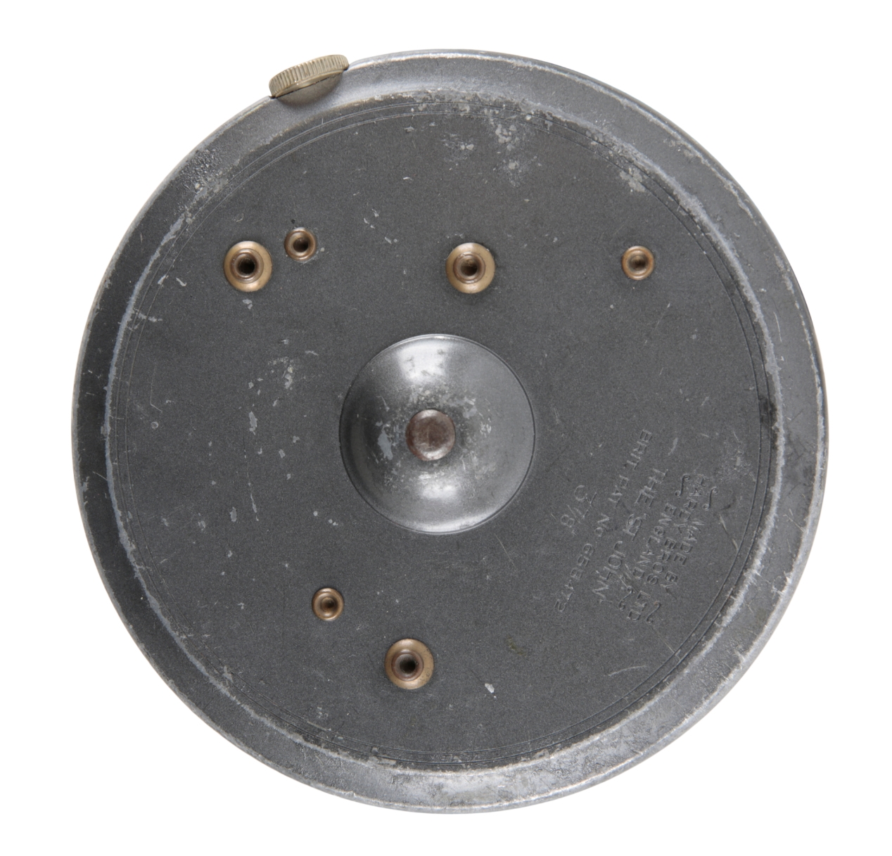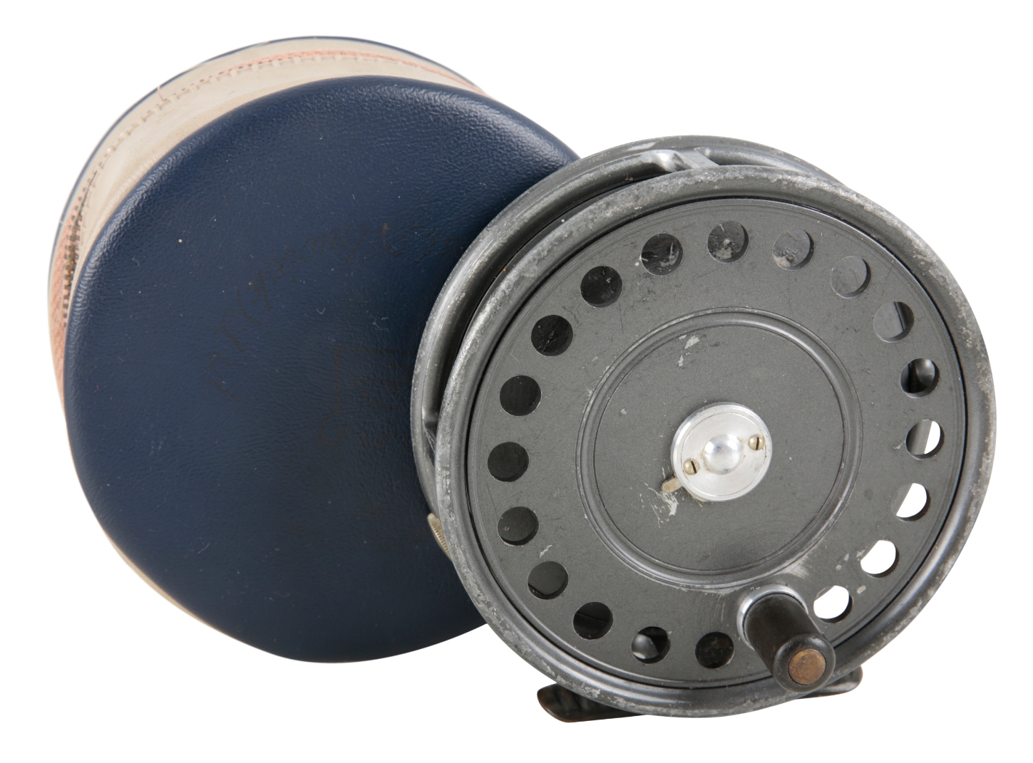 with smooth brass foot, ebonite handle, two screw latch and a nickel tension screw, in its original Hardy zip reel pouch