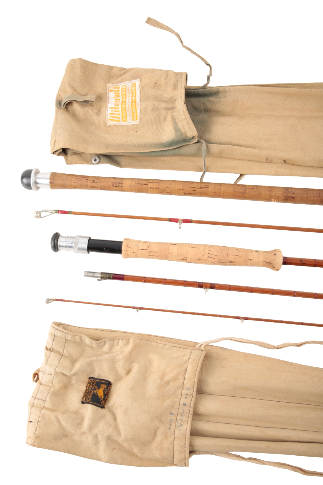 length 9ft6", no. E63709, in canvas rug bag; together with a Milwards Swimversa two piece split cane spinning rod, length 8ft9" (2)