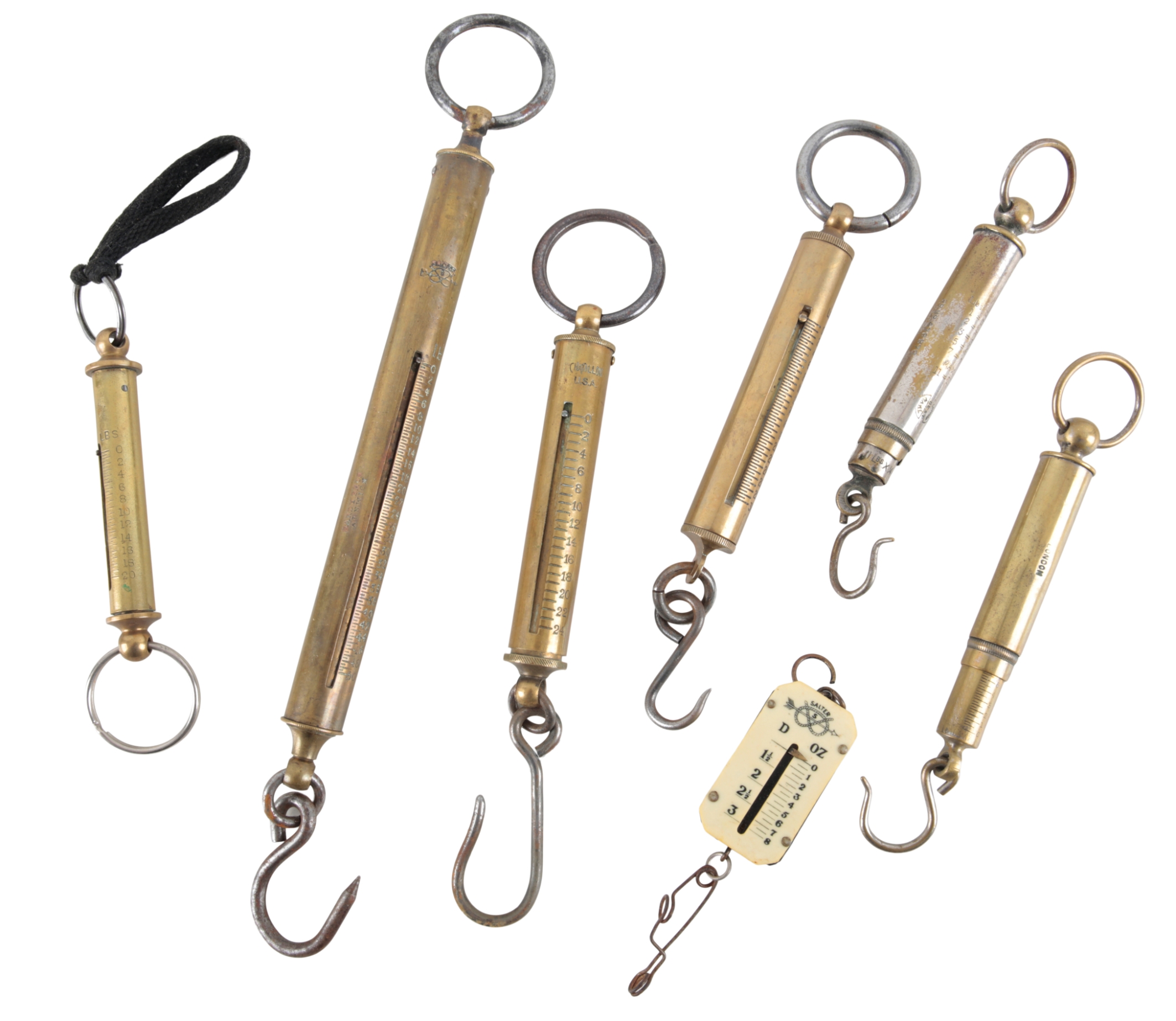 A COLLECTION OF SEVEN VARIOUS FISHING SCALES