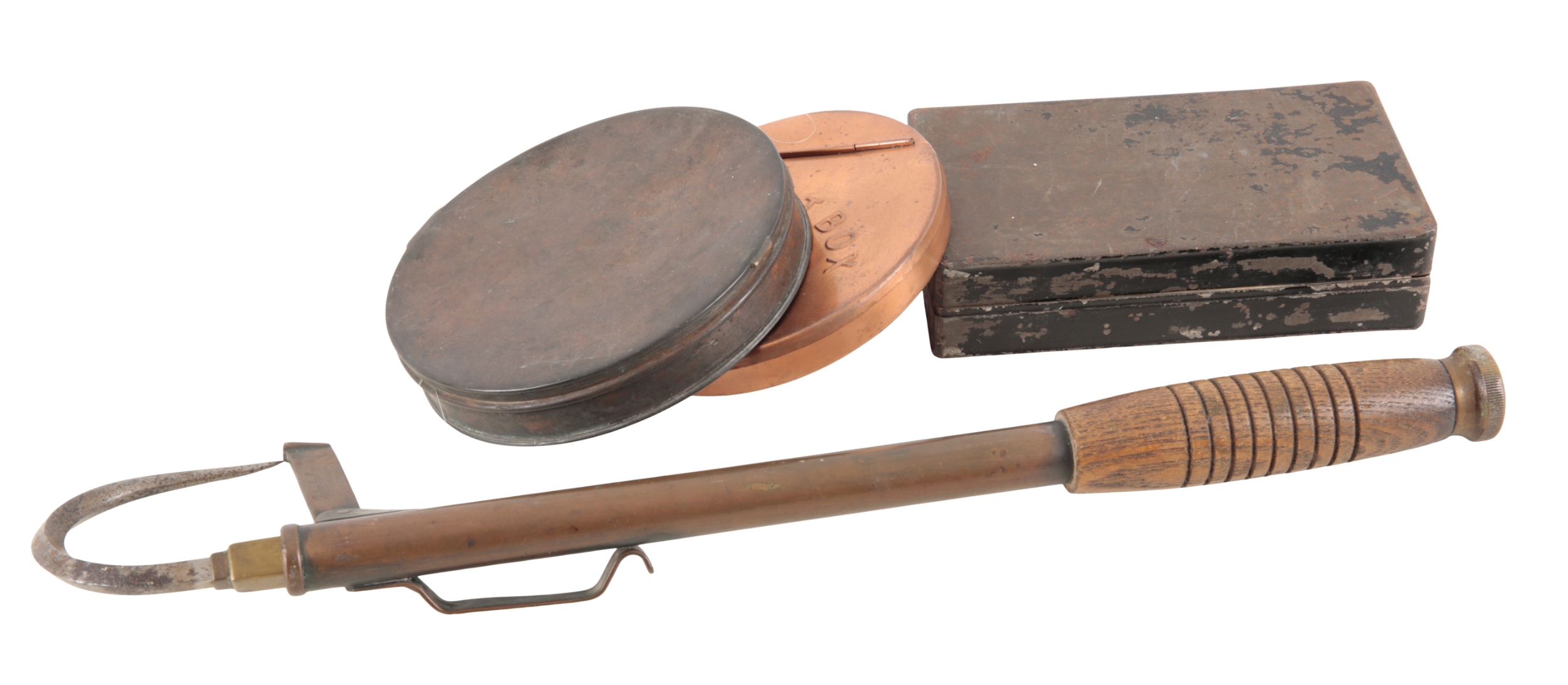 with oak wooden turned handle, 38cm long; together with a Farlows copper circular gut cast box; a summer copper gut cast box; and a black Japan spinning box (4)