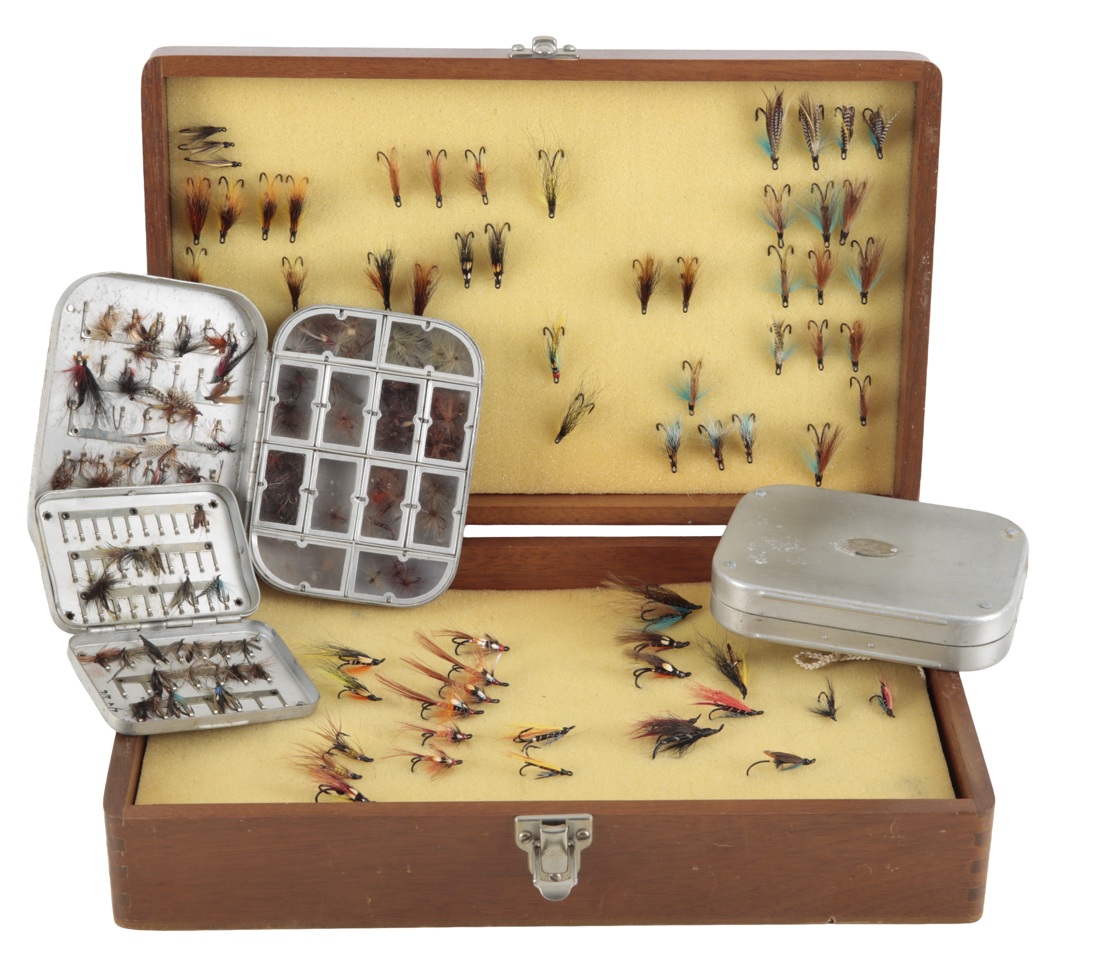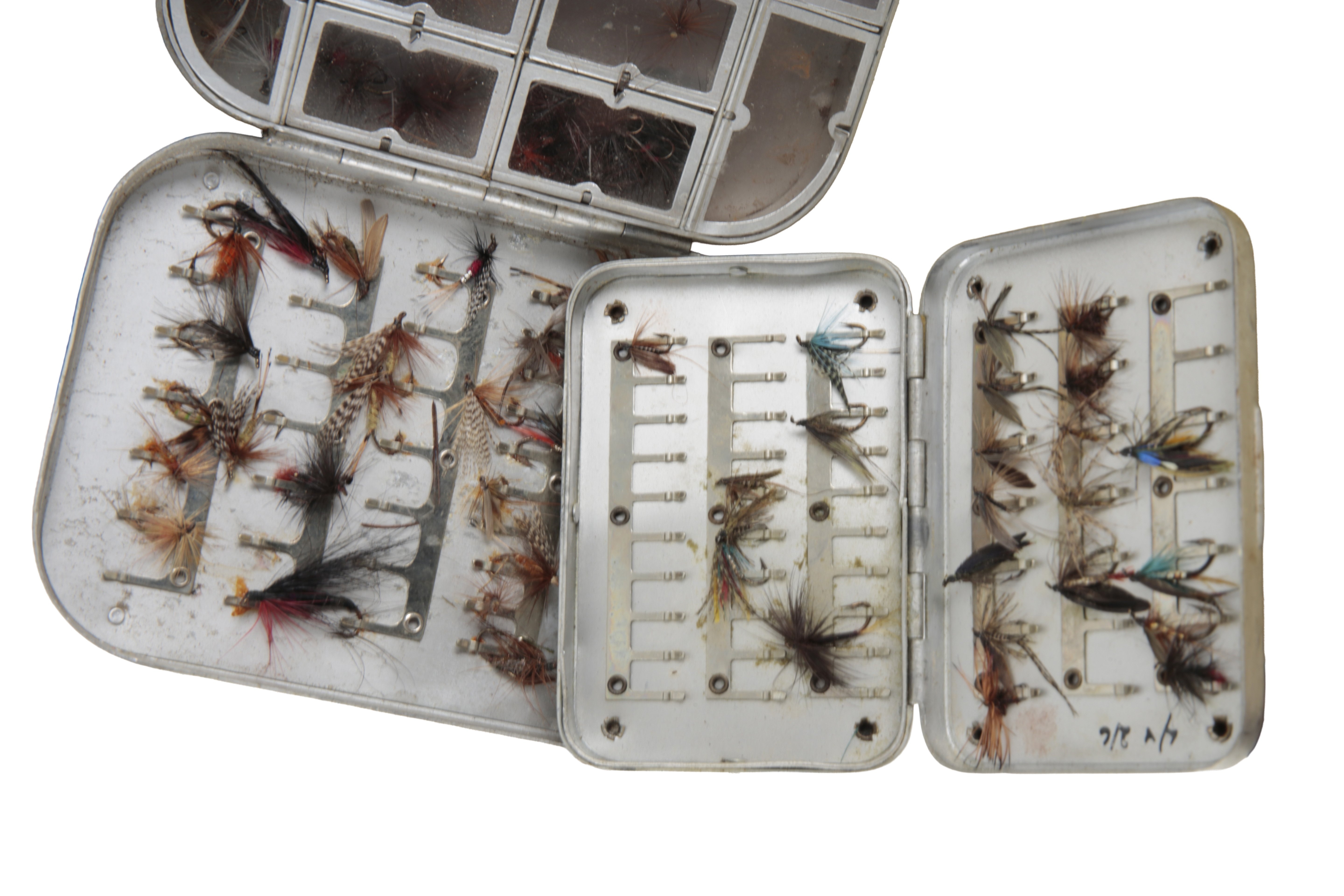 containing approximately 100 salmon flies (some mostly unused), 32cm wide x 20cm deep; together with a Wheatley dry fly box with 12 spring link compartments and flies; a similar Hardy Brothers twelve compartment box; and a small wet fly box with clips (4)