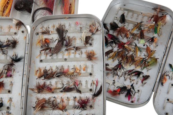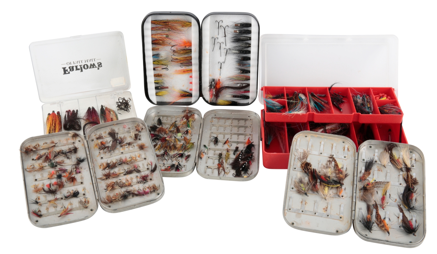with salmon tube flies; together with a Wheatley foam lined tube fly box with flies; a cantilever box of salmon tube flies; and three Wheatley alloy fly boxes, with a selection of mostly trout flies (6)