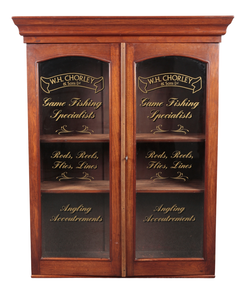 A 'W.H. CHORLEY & SONS... GAME FISHING SPECIALISTS' MAHOGANY WALL-MOUNTED CABINET