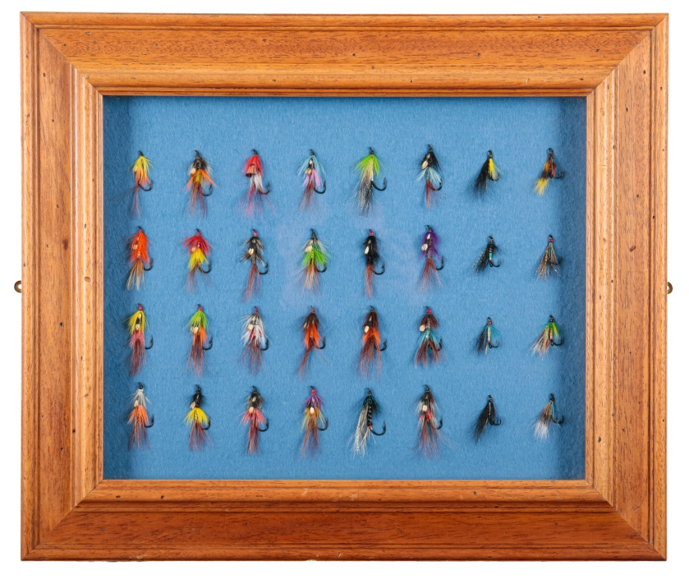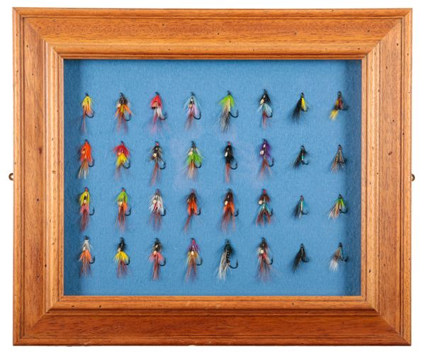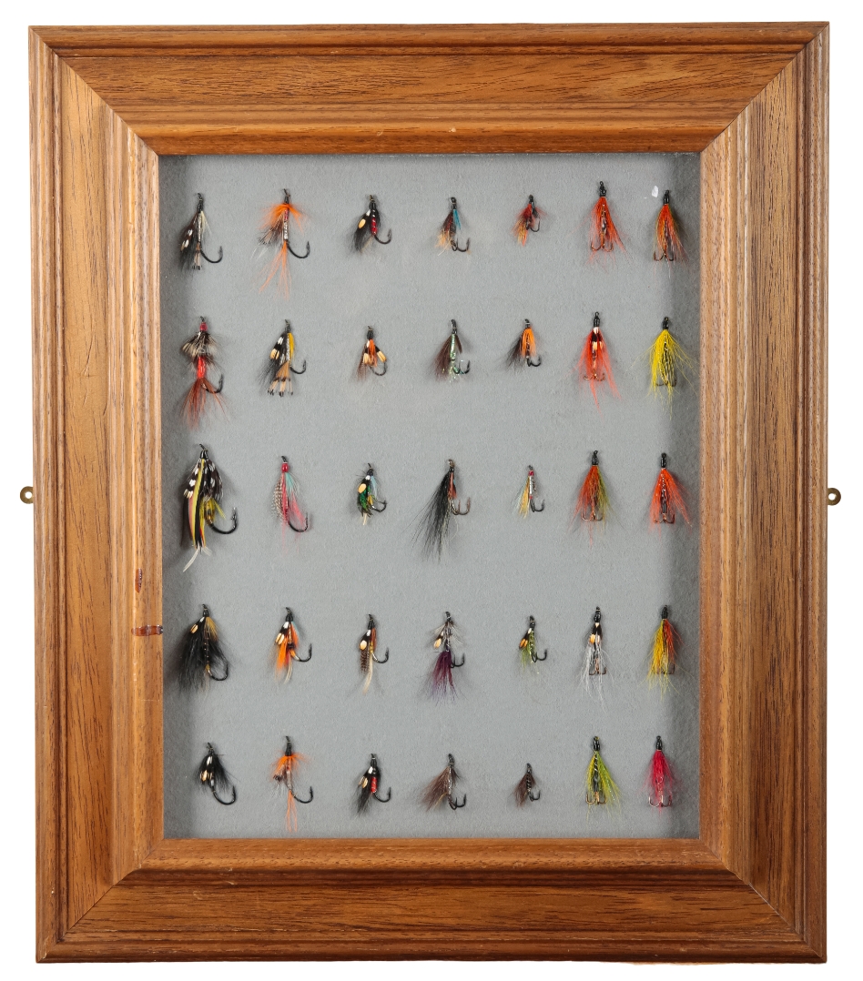 mounted in oak frames, approximately 68 flies, 28cm high x 36cm wide (2)