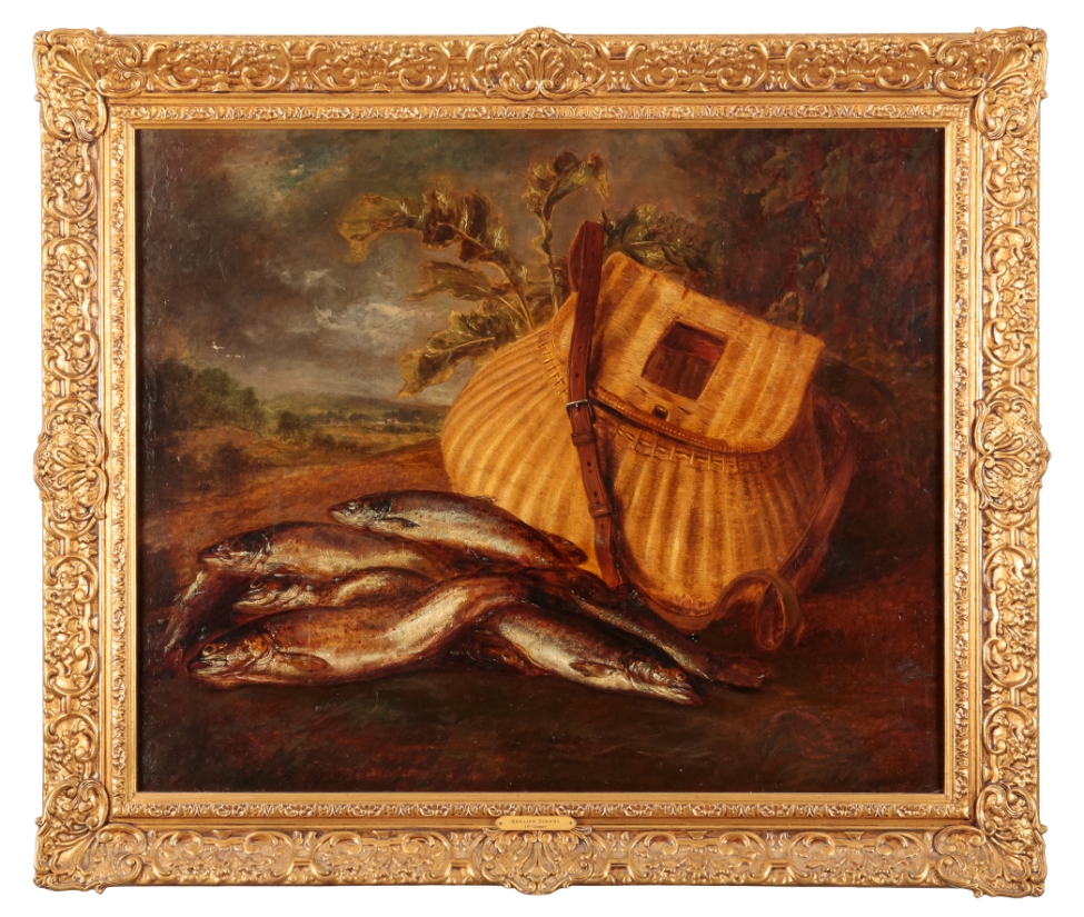 ENGLISH SCHOOL, 19TH CENTURY Caught fish and tackle basket in a landscape