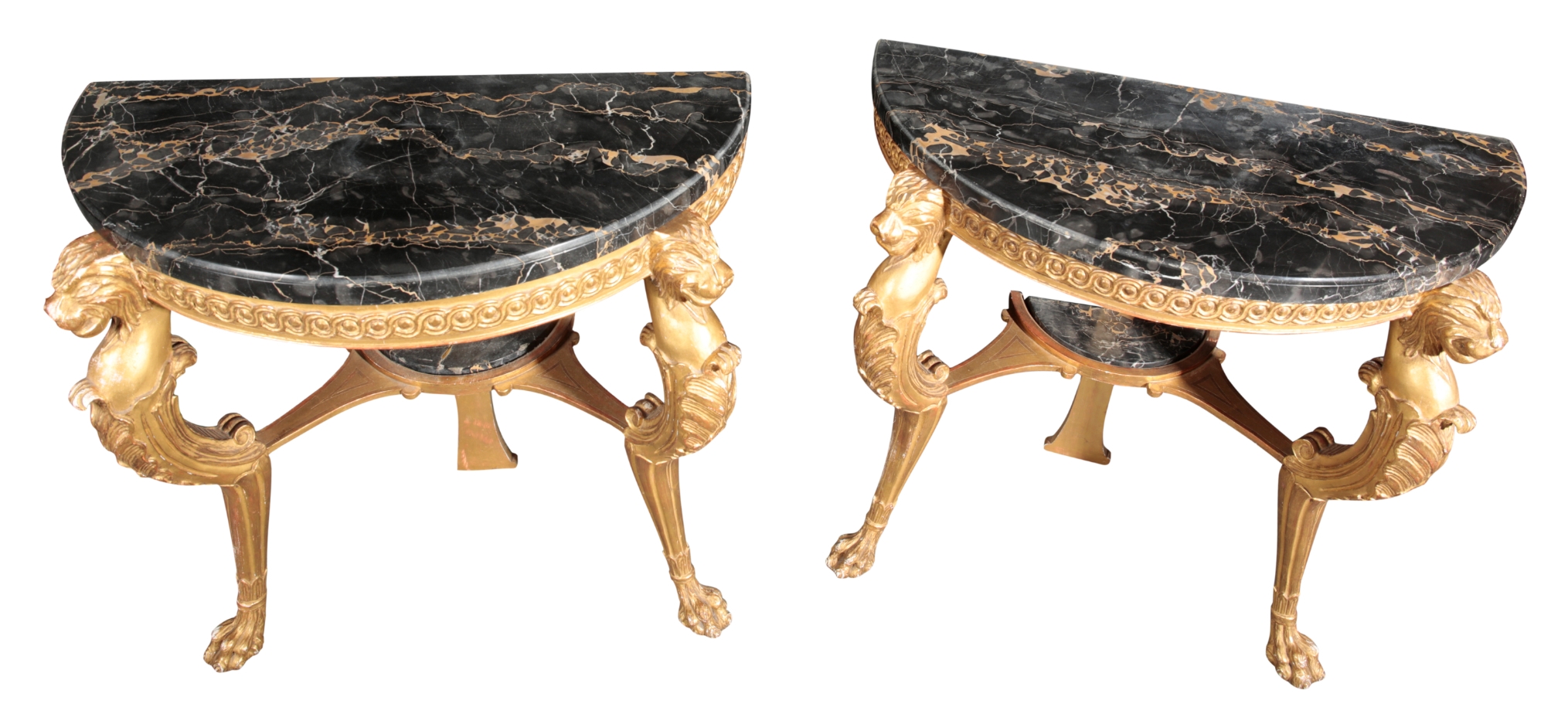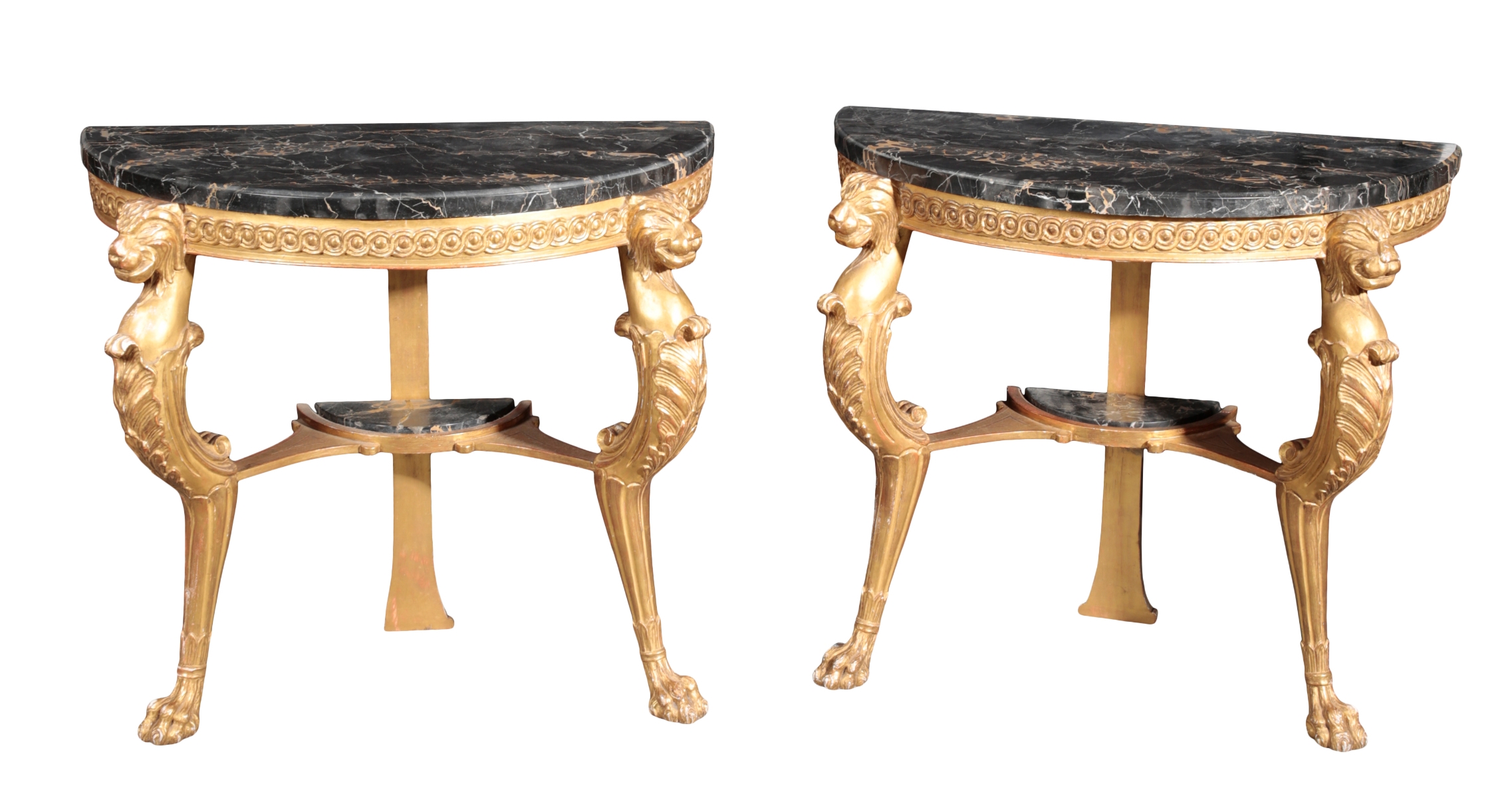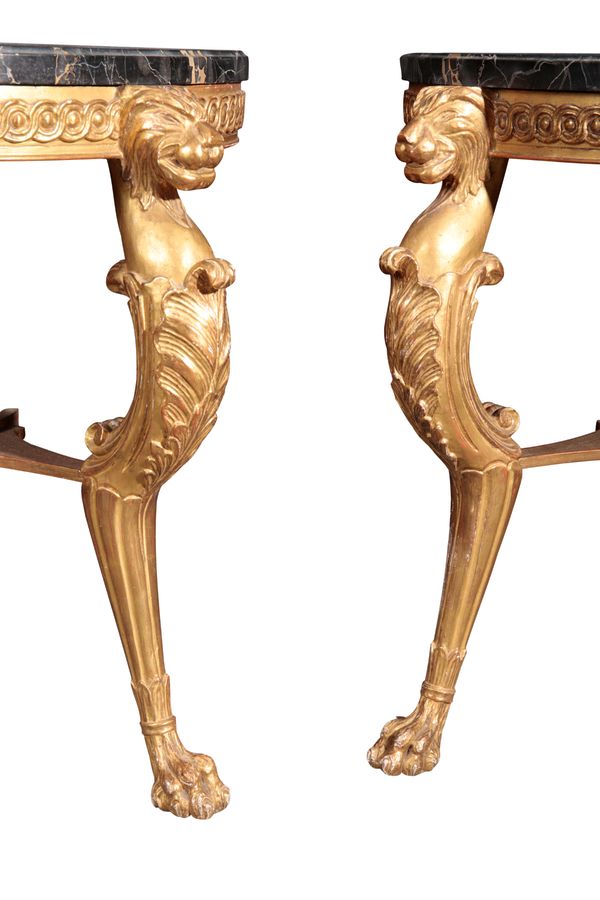 A PAIR OF GILTWOOD AND MARBLE-TOPPED CONSOLE TABLES