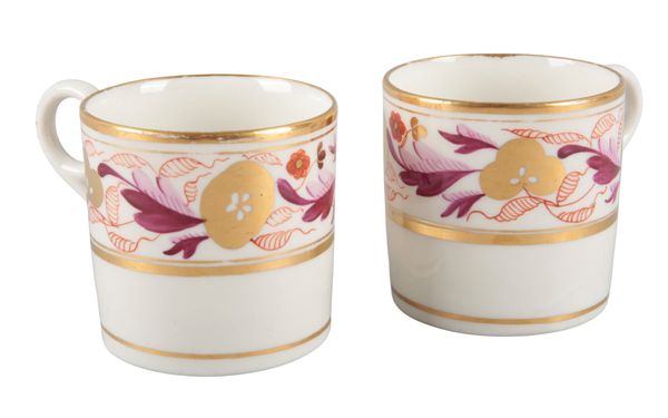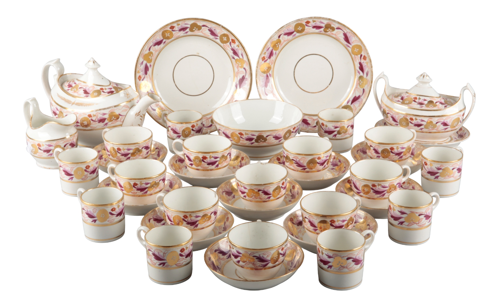early 19th century, pattern number '930', decorated with pink and gilt foliate banding, including a teapot, 15cm high, a stand, a sugar bowl, a slop bowl, two plates, 22cm diameter, ten cups, ten saucers and eight coffee cans; together with two similar English porcelain bowls, decorated in the popular '841' pattern, with floral sprays against a white ground, 19.5cm diameter (a lot)