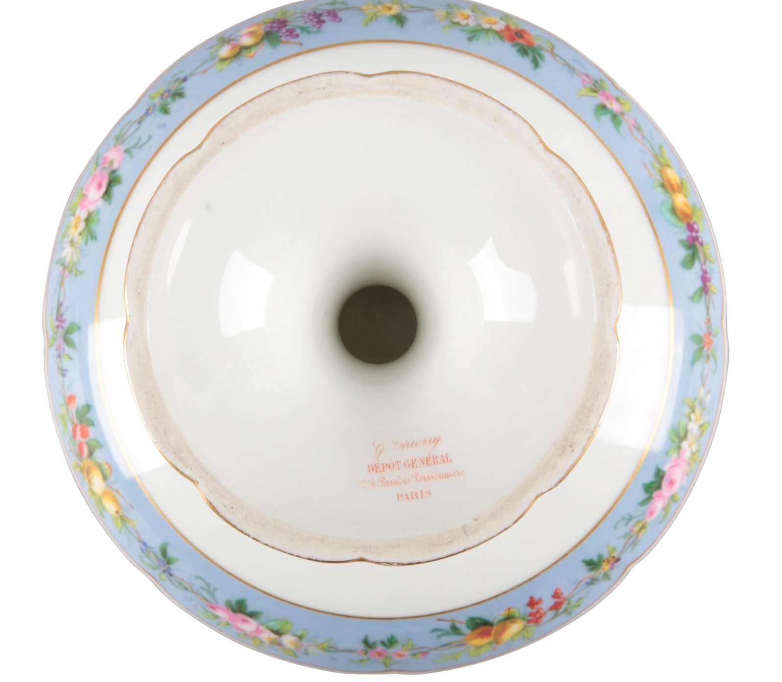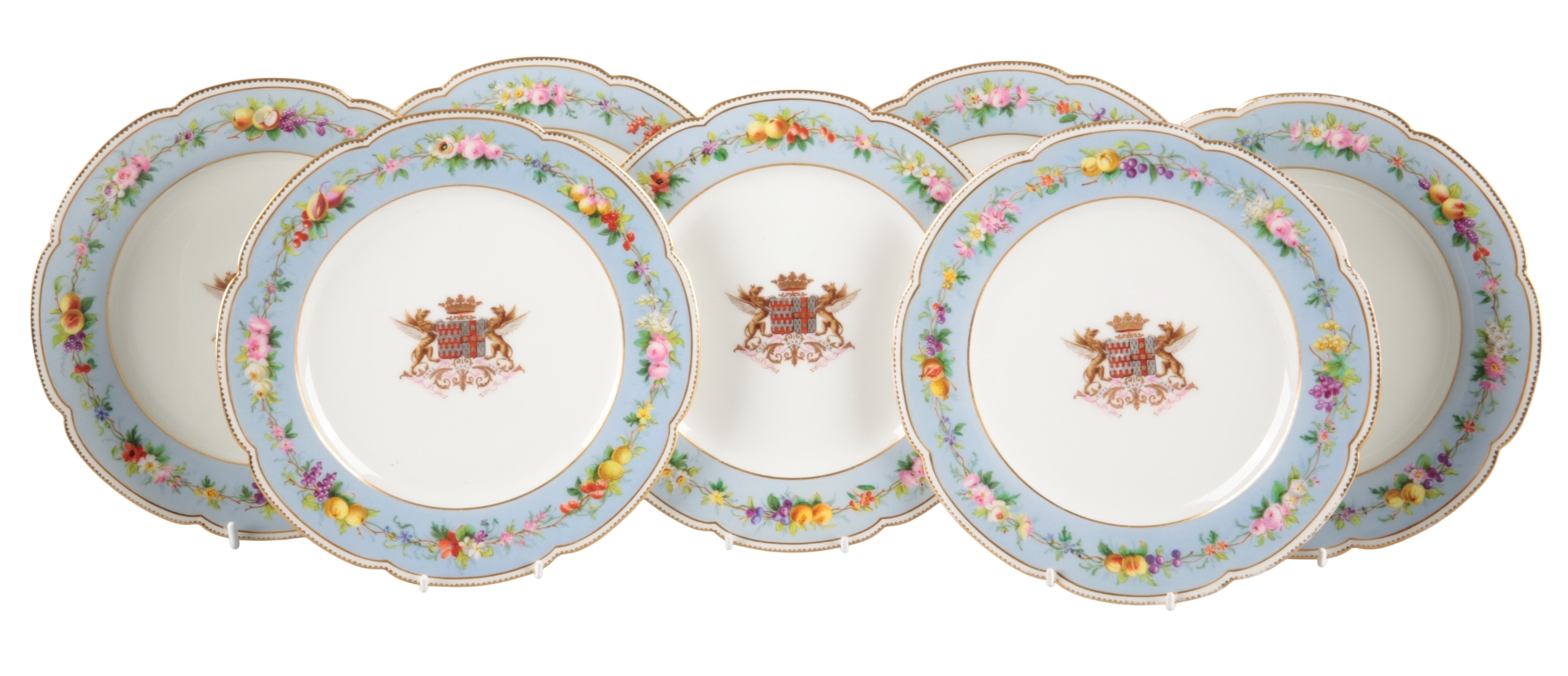 marked to the base 'G. Thierry, DEPOT GENERAL, 32. R. Paradis Poissonniere, PARIS', the plates all decorated with a French noble crest, probably the House of Mortemart, a branch of the Rochechouart House, within pale blue and foliate borders, comprising seven plates, 22cm diameter, and three stands (10)