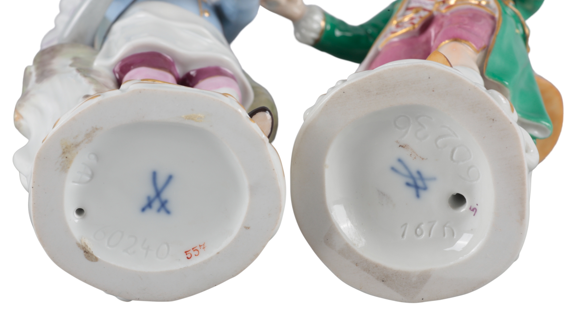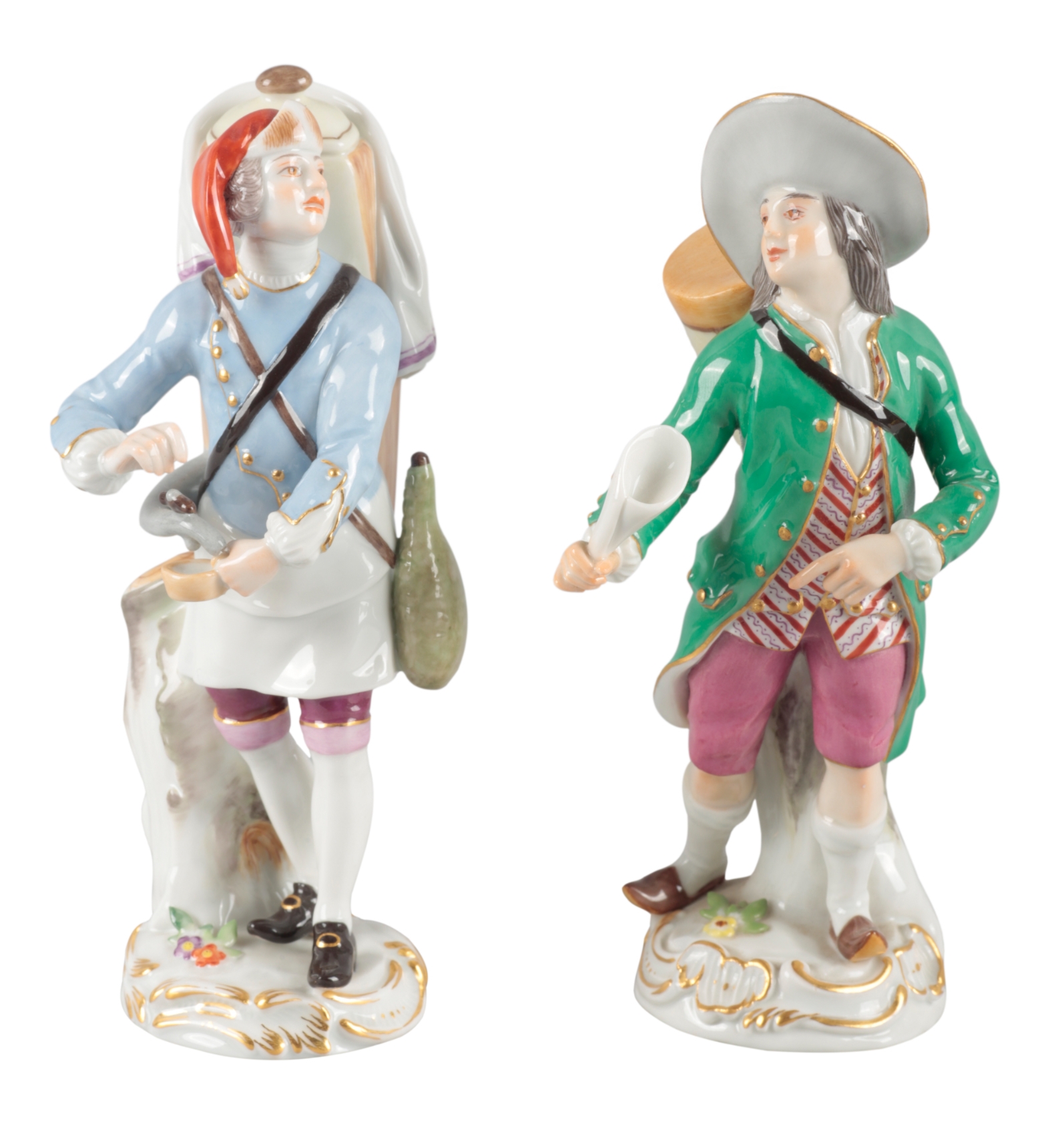 bearing blue underglaze crossed swords mark, incised 60236, further numbered 5, after the model by Peter Reineke from Bouchardon's 'Cris de Paris', 15.5cm high; together with the spirit seller, incised 60240 (2)