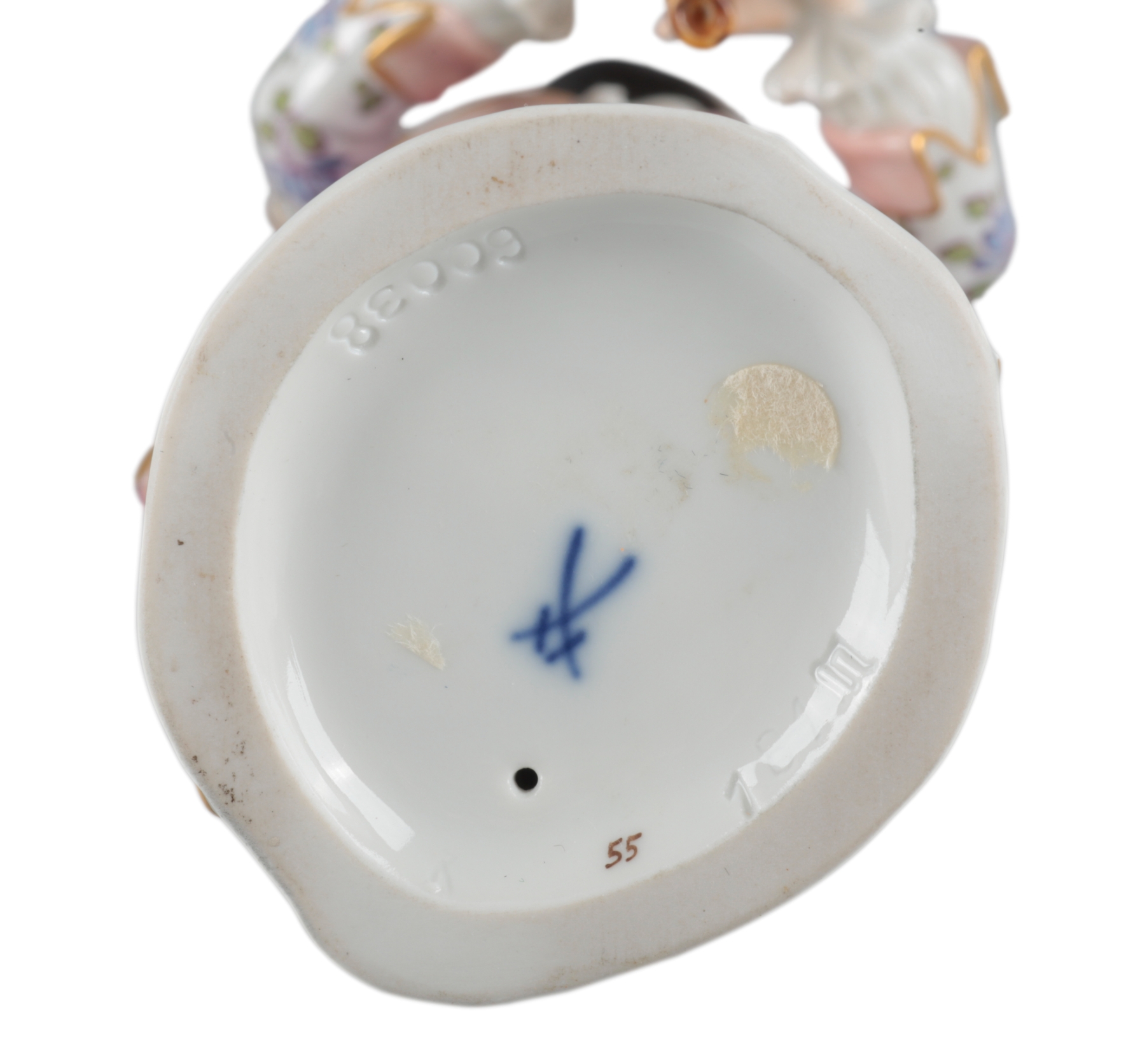 comprising the oboist, bearing blue underglaze crossed swords mark to the base, incised 60034, 86h, and further numbered 76, two flutists, incised 60038, and 60032, the drummer, incised 60224, 45AB, and the woman with a triangle, incised 60223, 209G, the tallest measuring 15cm (5)