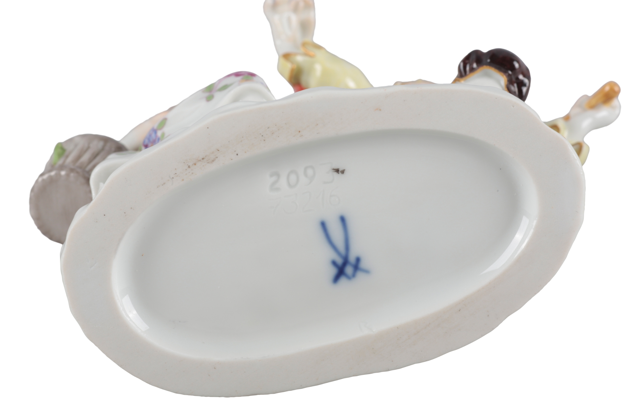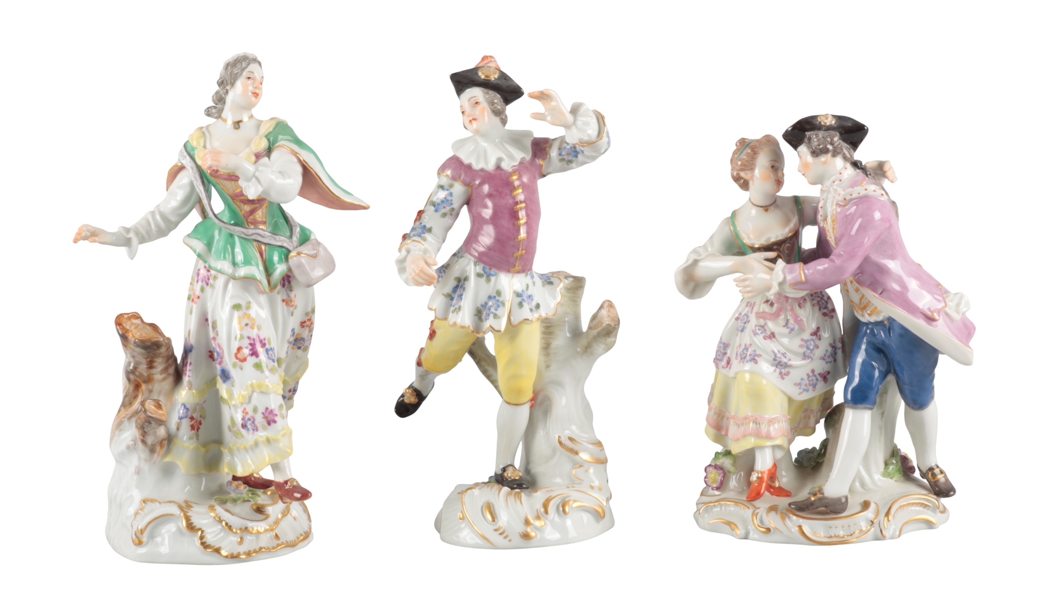 comprising a dancing couple, bearing underglaze blue crossed swords mark, incised 73332, 2063, further numbered 17, a dancing lady, 61121, a dancing gentleman, 61120, a figure of an actor, 60031, a lady and gentleman, incised 73256 and 73255, and three further figures incised 73215, 73216, and 7223, the tallest measuring 17cm high (7)