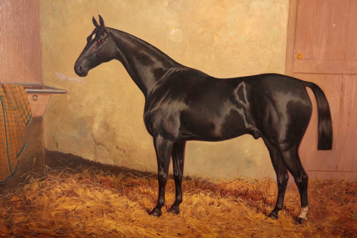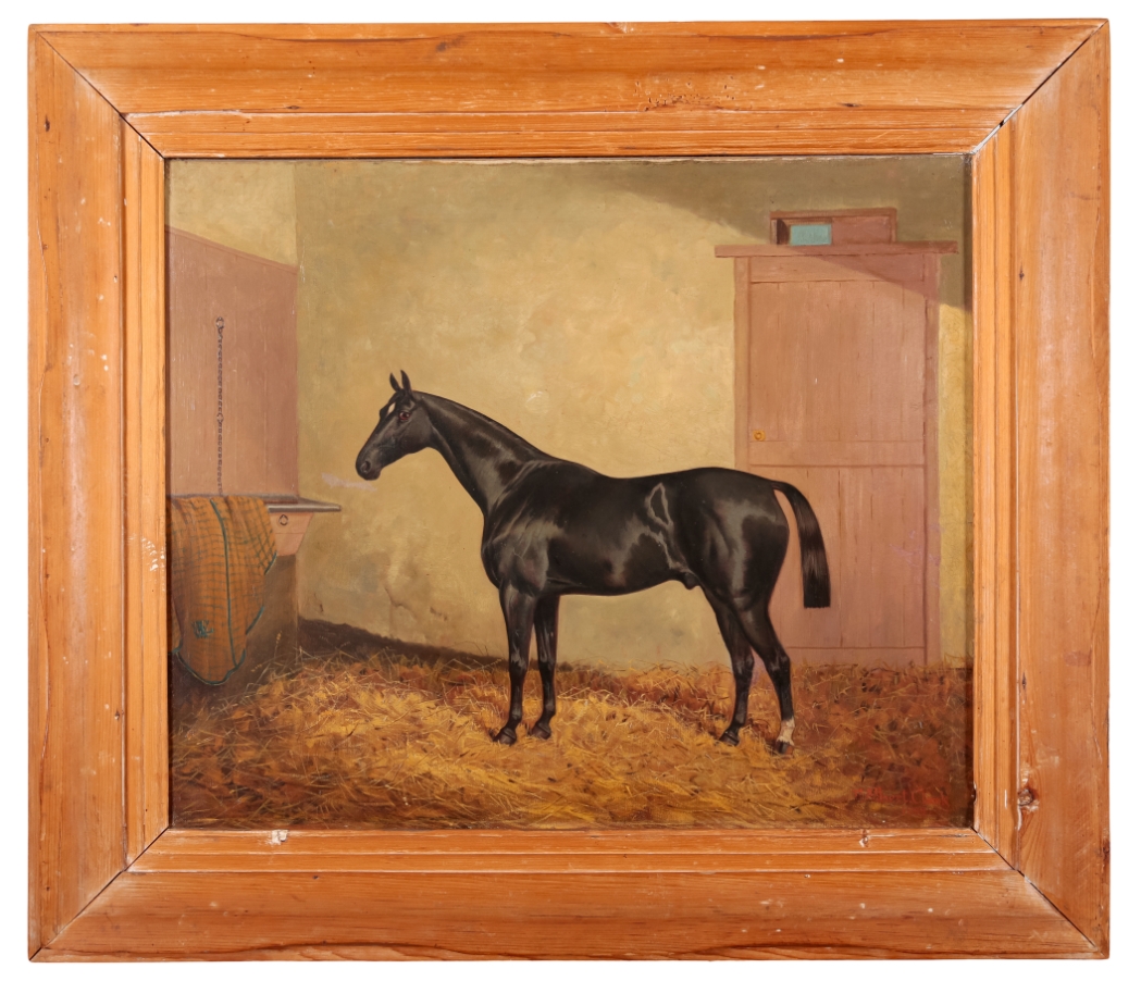 The painting is generally in good condition. The picture surface is stable and canvas surface tension is good; the painting seems to have been relined and restored. The picture bears some craquelure, as well as a notable mark below the horse's nose. The picture surface bears a glossy varnish layer. The frame bears some clear issues, including areas of discolouration and loss. The painting might benefit from being reframed. It comes from a private Surrey estate. Please see additional images available on request.