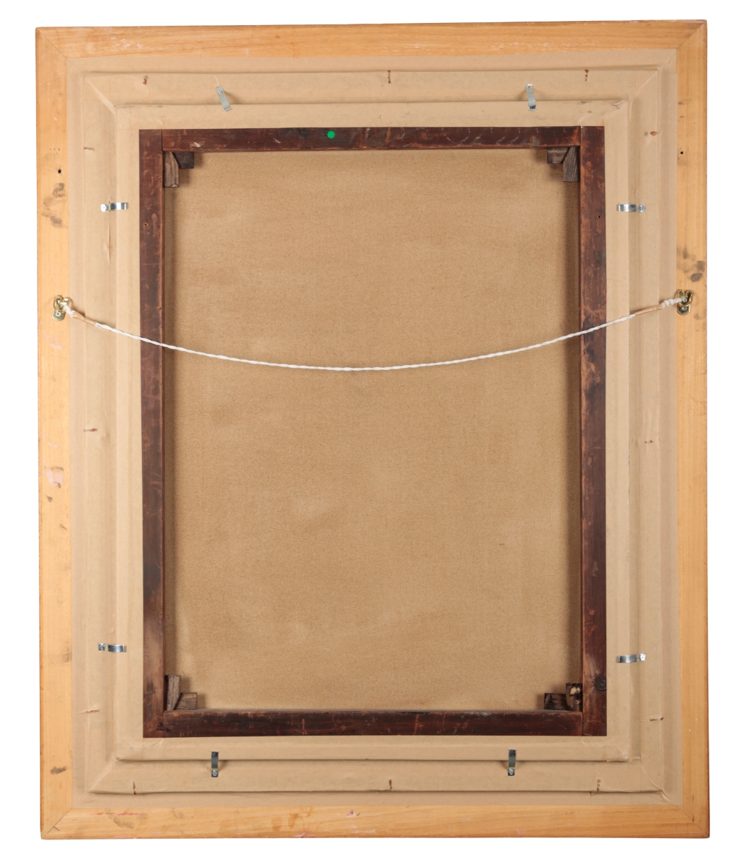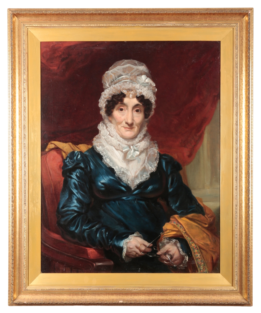 seated, half-length, wearing a blue dress and white bonnet, oil on canvas, 90cm x 69cm
